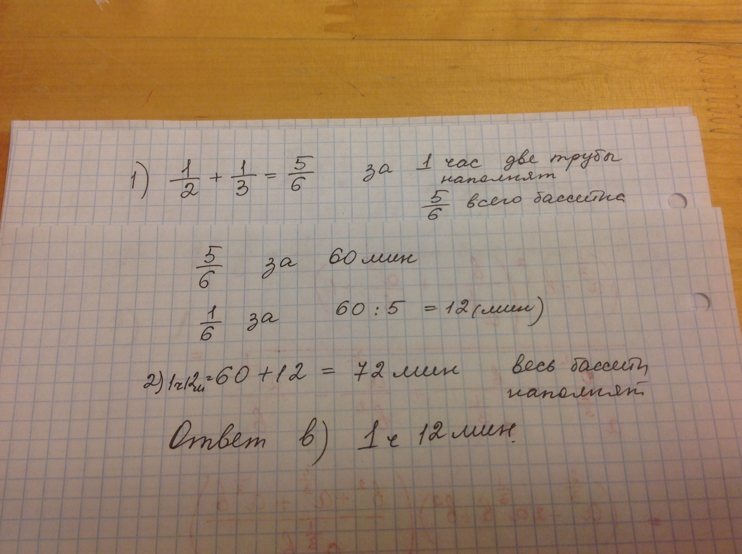 каждый час труба наполняет 1/2 бассейна, а вторая 1/3 бассейна. За какое время обе трубы наполнят бассейн.