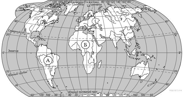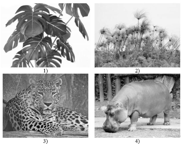 Рассмотри карту мира. На ней буквами А и Б отмечены два материка.Далее представлены изображения бегемота, монстеры, ягуара и папируса.