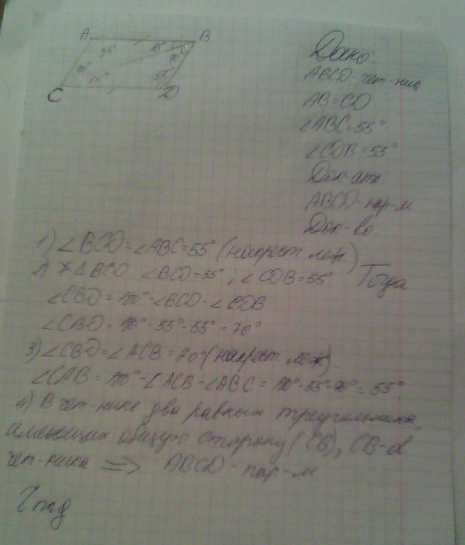 четырехугольнике ABCD AB равен CD Угол ABC равен 55 градусов угол cdb равен 55 градусов докажите ABCD параллелограмм