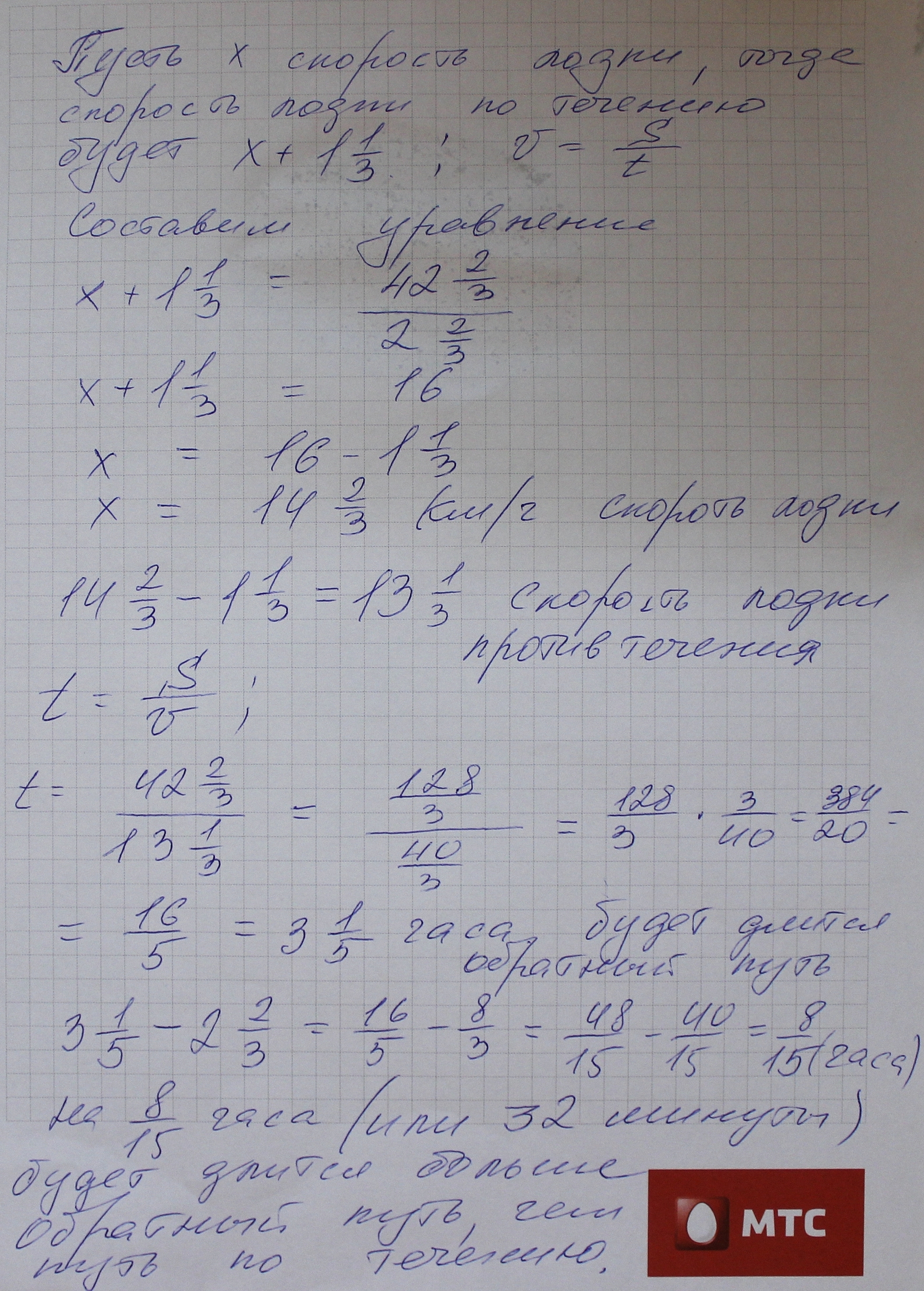 Човен проплив 42 цілі 2 треті км за течією річки за 2 цілі 2 треті год. На скільки більше часу буде тривати зворотний шлях,