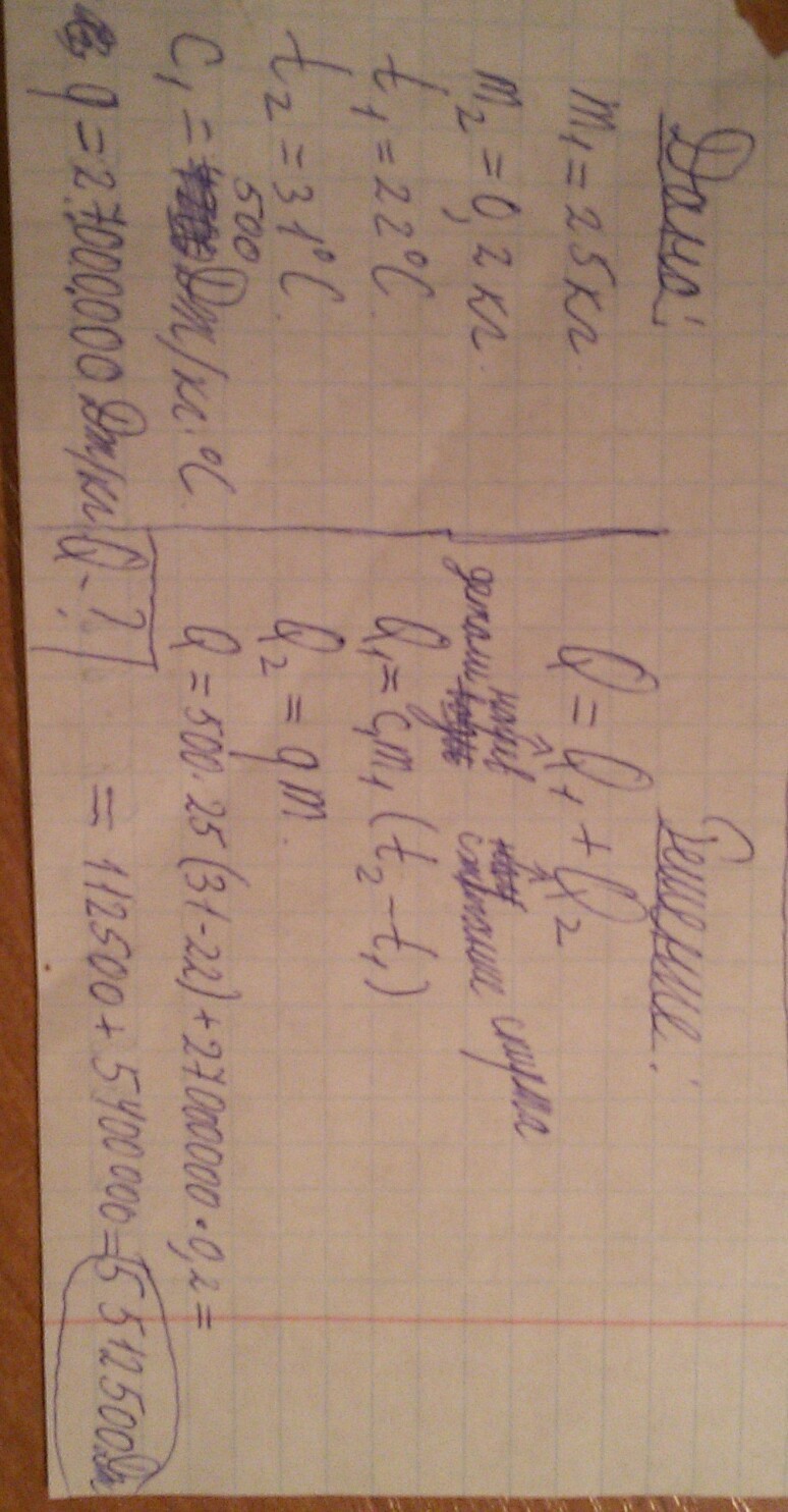 кол-во теплоты, полученное стальной деталью m=25 кг при нагревании, которое произошло в следствие сжигания 200 г спирта. деталь нагрелась от 22°С до 31°С. Найдите кол-во теплоты