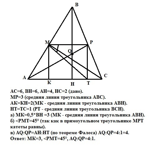 а) МК=0,5*ВН =3 (МК - средняя линия треугольника АВН).