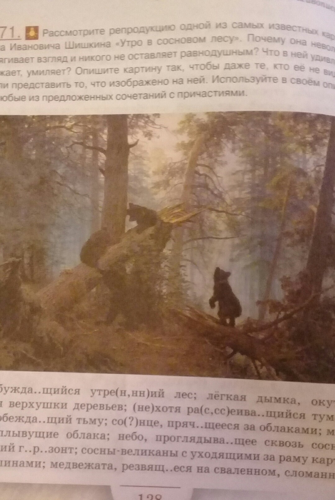 На картине изображено несколько медведей . весенний лес так прекрасен . утренним лесом просыпаются зверки и птицы.везде туманы лёгкой дымкой поднимаются. деревья после громкой молние поломали пополам на ети деревья забрались медведи монастырь и большие. птицы всё поют себе и поют этот лес прекрасен . всем животным уютно.