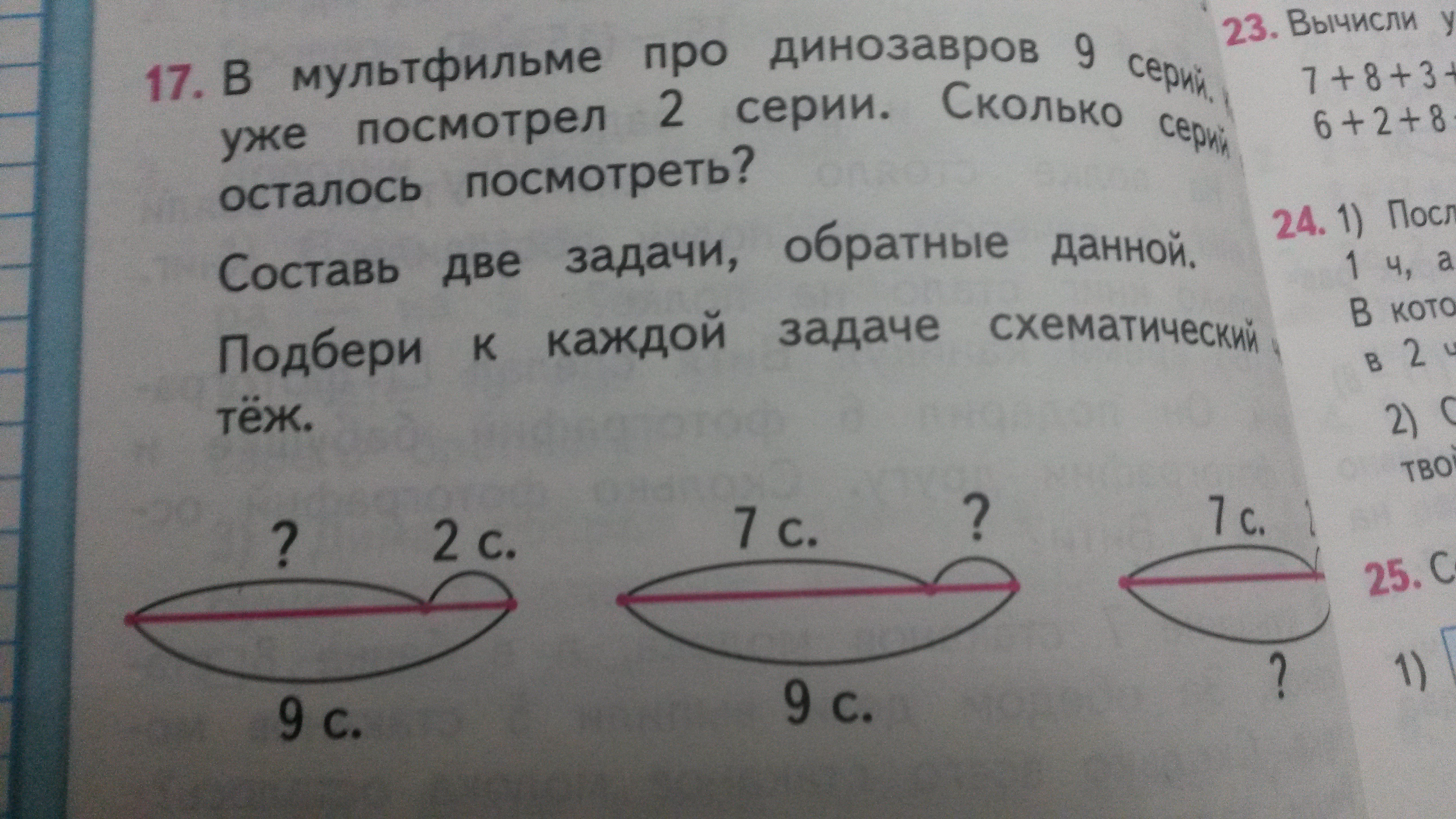 1) Коля просмотрел 2 серии,ему осталось посмотреть 7 серий. Сколько серий было всего?