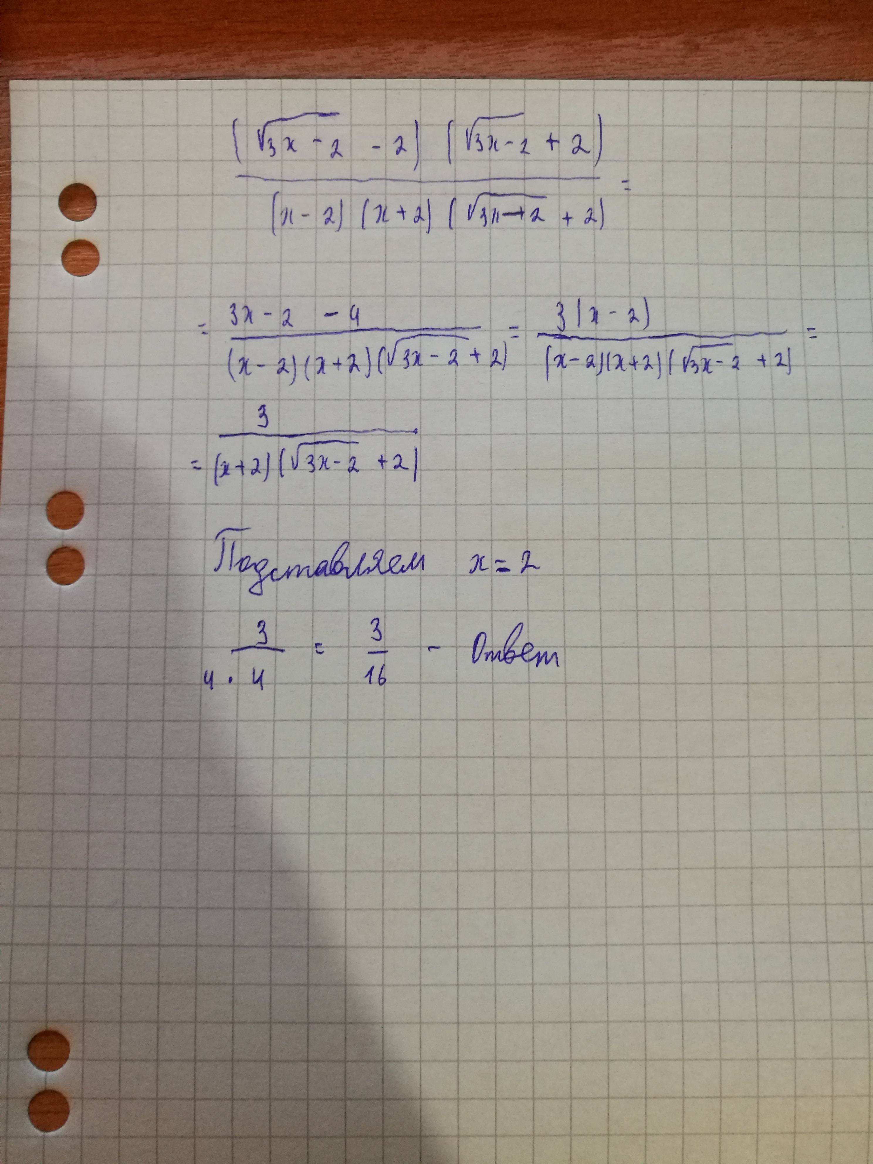 д)Подставив 2, получаем неопределённость вида: (0/0), значит надо изменить уравнение. Очевидным решением является избавление от корня. Вспоминаем формулу (a-b)*(a+b)=a^2-b^2, домножаем числитель и знаменатель на (sqrt(3x-2)+2) Дальнейшее решение на фото: