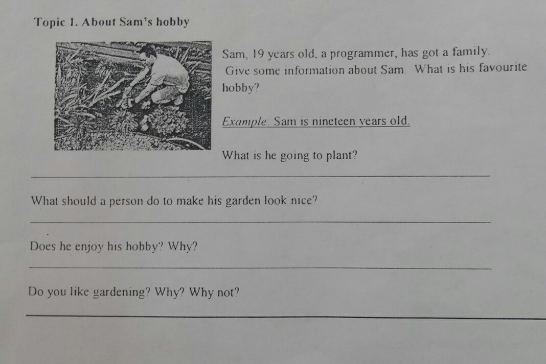 Sam is nineteen years old. ( Сэму 19 лет)He is going to plant flowers. ( Он собирается сажать цветы )To make his garden to look nice a person must take care of plants. ( Чтобы сад выглядел хорошо, человек должен заботиться о растениях)He enjoys his hobby because he likes plants. ( Он получает удовольствие от своего хобби , потому что любит растения)I like gardening too because I like flowers too .( Я тоже люблю садоводство, потому что я тоже люблю цветы.)