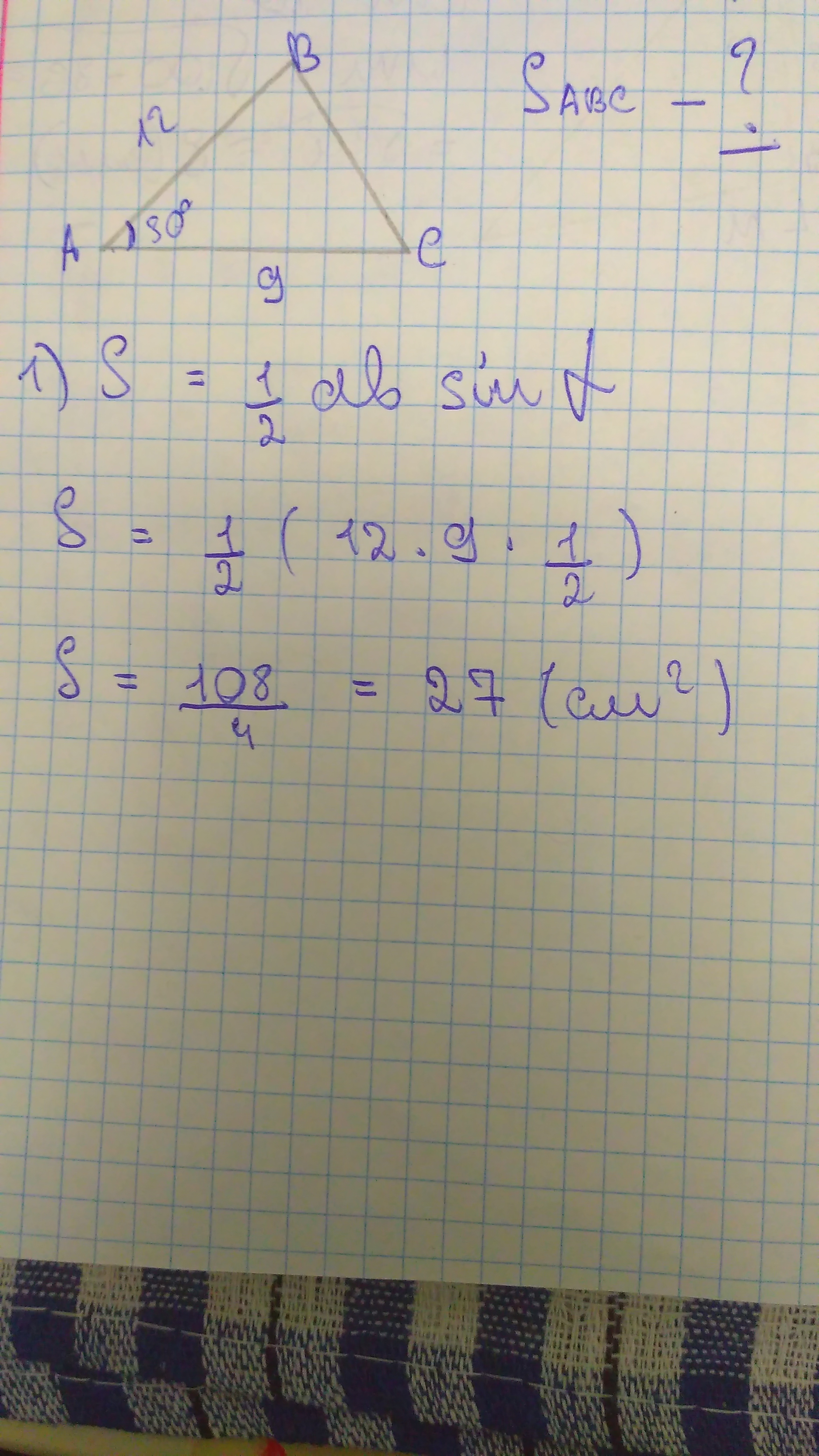 В треугольнике АВС АС=9 см, АВ=12 см, угол А=30 градусов. Найти площадь треугольника АВС. заранее спасибо вроде знаю но хочу убедиться