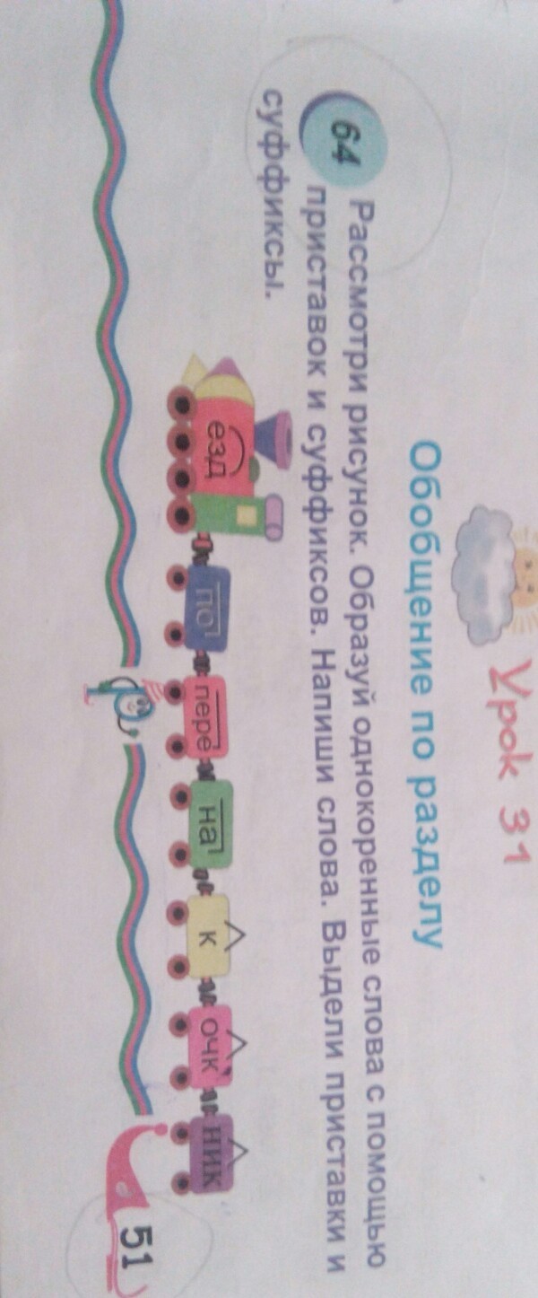 рассмотри рисунок.образуй однокоренные слова с помощью приставок и суффиксов.напиши слова.выдели приставки и суффиксы.
