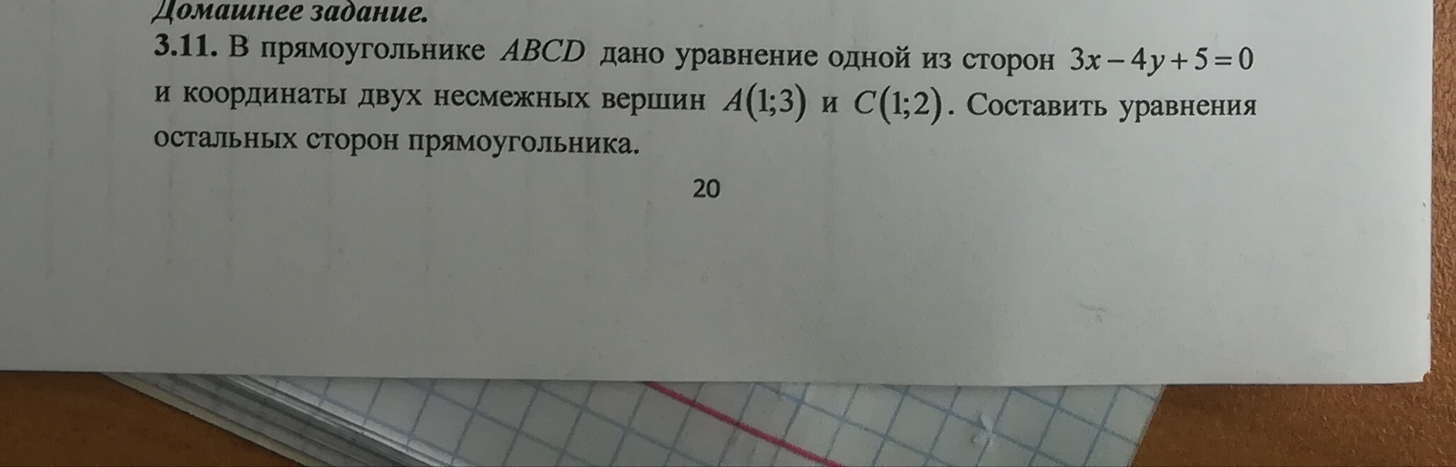 3) Уравнение прямой (стороны прямоугольника) проходящей через точку A(1;3) перпендикулярной прямой
