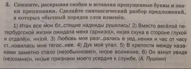 Итак, все мои блестящие надежды разрушились! Вместо весёлой петербургской жизни ожидала меня гарнизонная скука в стороне глухой и отдалённой. Любовь моя разгоралась(гореть) в уединении(един), и час от часу становилась(станет) мне тягостнее(непроизносимая согласная "т"). Дух ой упал. В крепости между казаками заметно стало необыкновенное(пишется слитно, так как данное имя прилагательное можно заменить синонимами "необычный" "прекрасный" и т.д.) волнение. Он ахнул, увидя несомненные(бесспорные) признаки моего усердия. службе