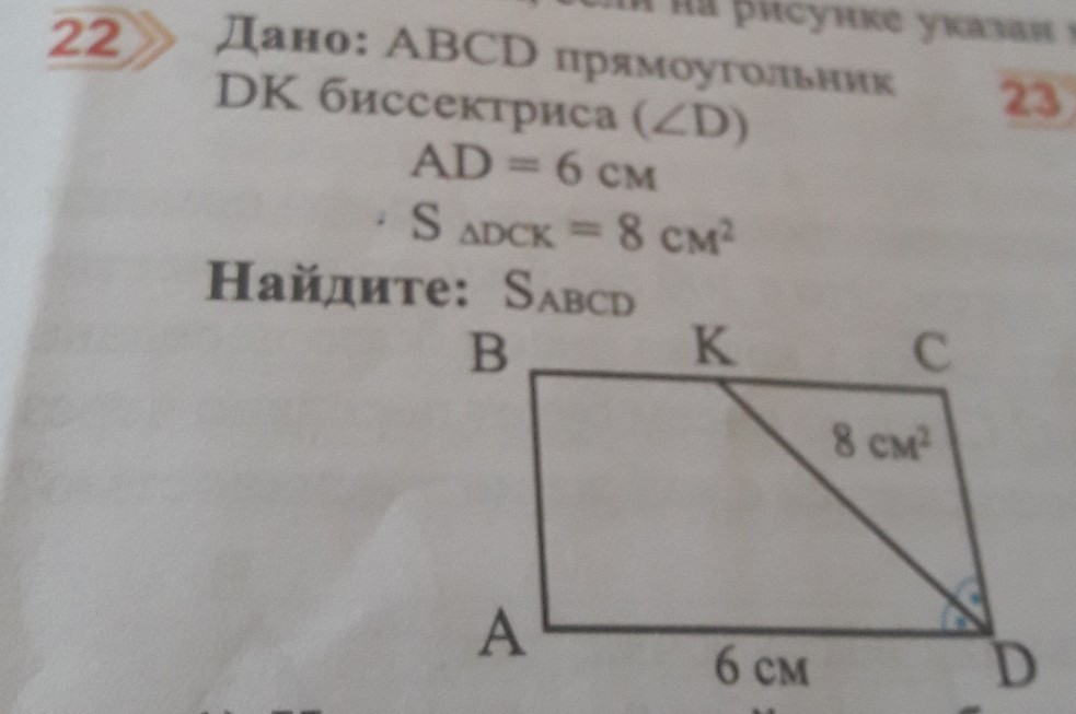 KCD - равнобедренный треугольник, т.к. ∠D и С - прямые, биссектриса делит ∠D пополам, ∠K =45° KC=CD