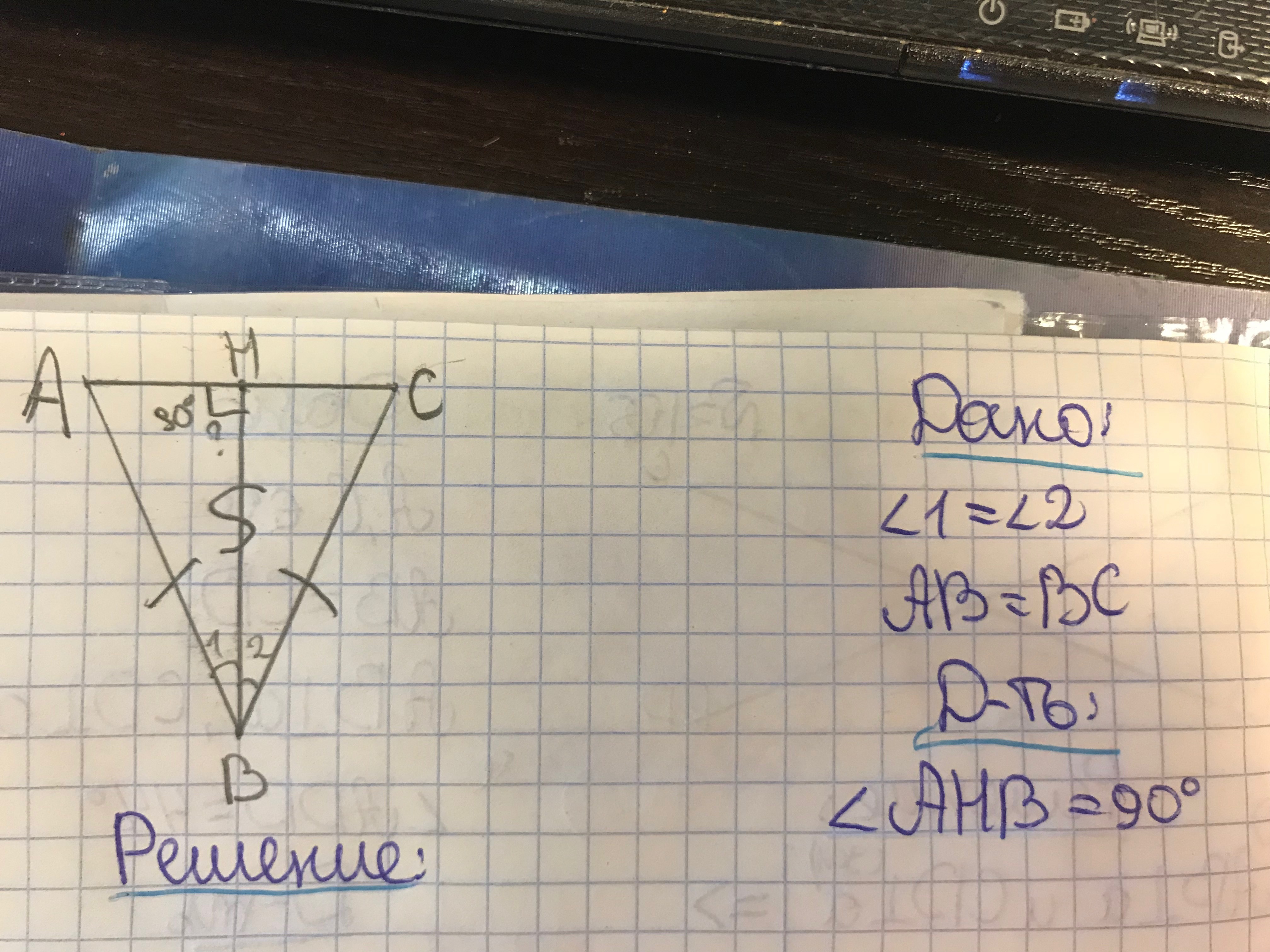 это р/б треугольник, т.к. у него равны боковые стороны, угол 1и 2 равны, следовательно ВН биссектриса. а в р/б треугольнике биссектриса является и высотой, следовательно угол АНВ равен 90°