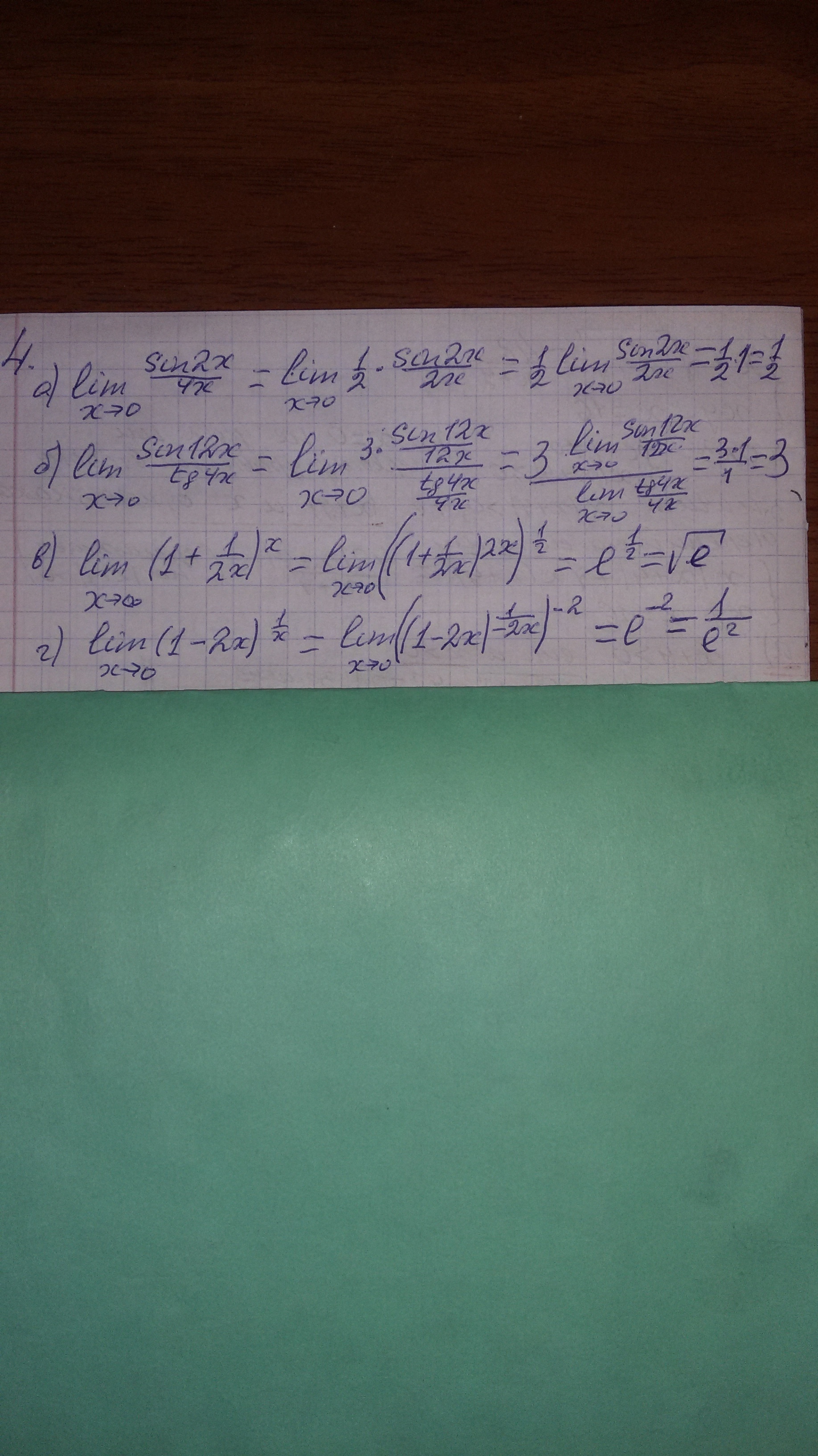 ![lim_{x to infty} (1+ frac{1}{2x} )^x=lim_{x to infty} [(1+ frac{1}{2x} )^{2x* frac{1}{2x} } ]^x= \ \ =lim_{x to infty} [(1+ frac{1}{2x} )^{2x} ]^{ frac{1}{2x} *x}=lim_{x to infty} [(1+ frac{1}{2x} )^{2x} ]^{ frac{1}{2}}=e^{frac{1}{2}} = sqrt{e} lim_{x to infty} (1+ frac{1}{2x} )^x=lim_{x to infty} [(1+ frac{1}{2x} )^{2x* frac{1}{2x} } ]^x= \ \ =lim_{x to infty} [(1+ frac{1}{2x} )^{2x} ]^{ frac{1}{2x} *x}=lim_{x to infty} [(1+ frac{1}{2x} )^{2x} ]^{ frac{1}{2}}=e^{frac{1}{2}} = sqrt{e}](https://tex.z-dn.net/?f=+lim_%7Bx+to+infty%7D+%281%2B++frac%7B1%7D%7B2x%7D+%29%5Ex%3Dlim_%7Bx+to+infty%7D+%5B%281%2B+frac%7B1%7D%7B2x%7D+%29%5E%7B2x%2A+frac%7B1%7D%7B2x%7D+%7D+%5D%5Ex%3D+%5C++%5C+%3Dlim_%7Bx+to+infty%7D+%5B%281%2B+frac%7B1%7D%7B2x%7D+%29%5E%7B2x%7D+%5D%5E%7B+frac%7B1%7D%7B2x%7D+%2Ax%7D%3Dlim_%7Bx+to+infty%7D+%5B%281%2B+frac%7B1%7D%7B2x%7D+%29%5E%7B2x%7D+%5D%5E%7B+frac%7B1%7D%7B2%7D%7D%3De%5E%7Bfrac%7B1%7D%7B2%7D%7D+%3D+sqrt%7Be%7D+)