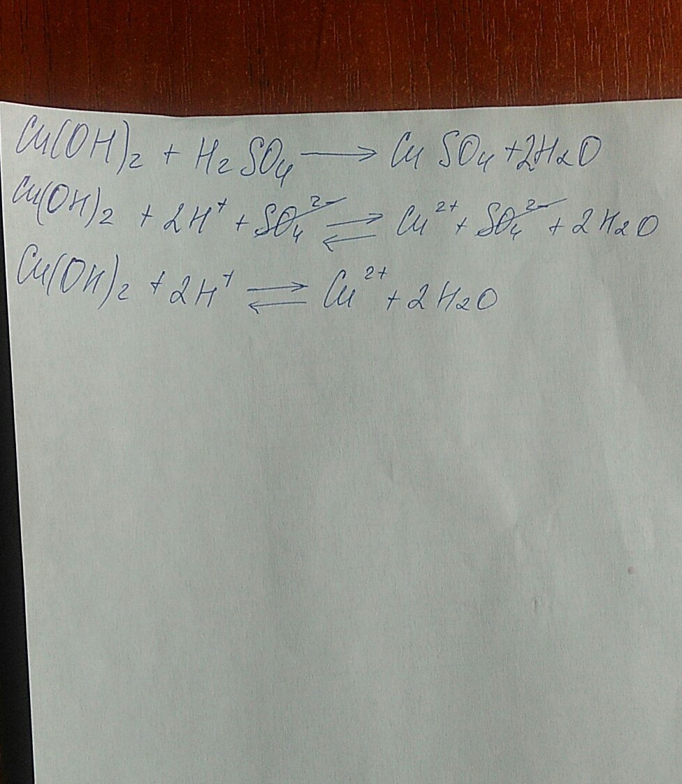 Допишите уравнение реакции ионного обмена: Cu(OH)2+H2SO4=. Запишите данное уравнение реакции в трех формах (молекулярное уравнение, ионное и сокращенное ионное).