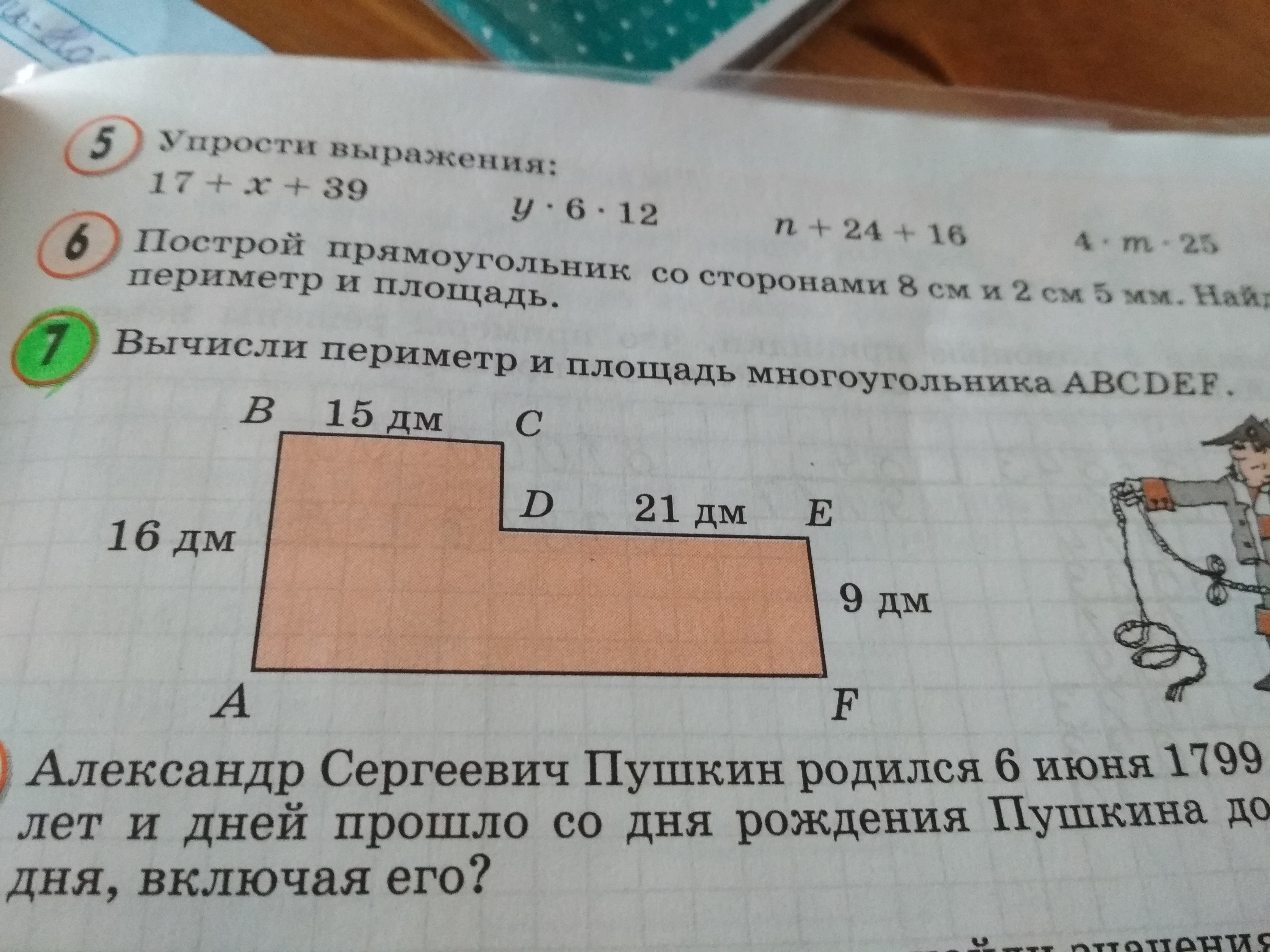 15 * 7 = 105 (кв.дм) - площадь верхнего прямоугольника