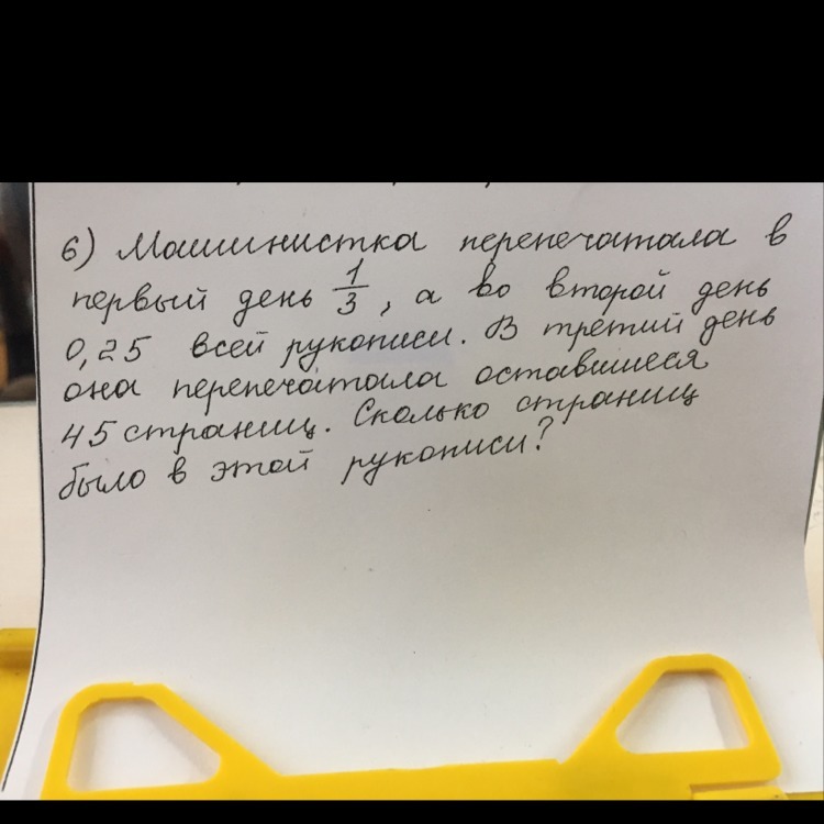 Машинистка перепечатала в первый день 1/3 ,а во второй день 0,25 Всей рукописи.В третий день она перепечатала оставишеся 45 страниц .сколько страниц было в этой рукописи