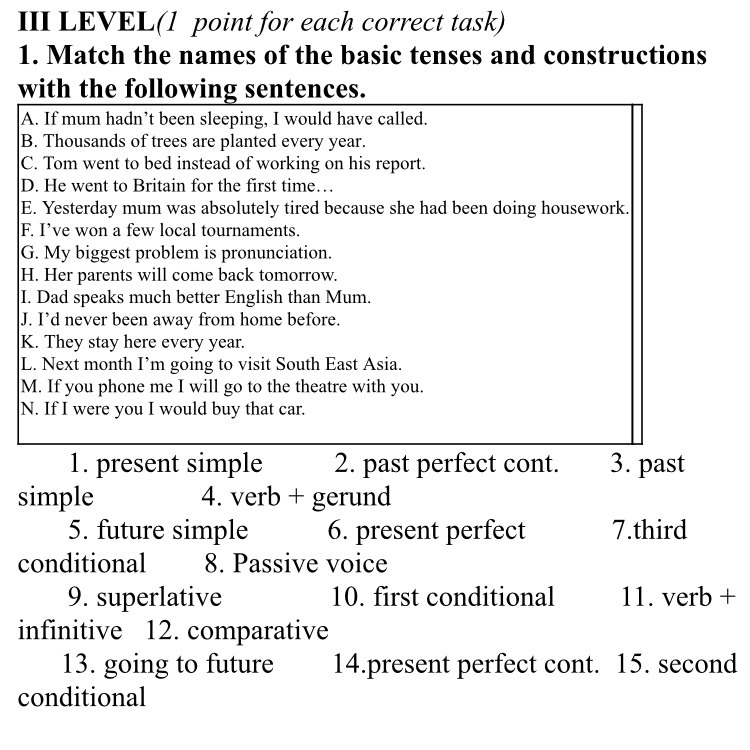 1. Match the names of the basic tenses and constructions with the following sentences.