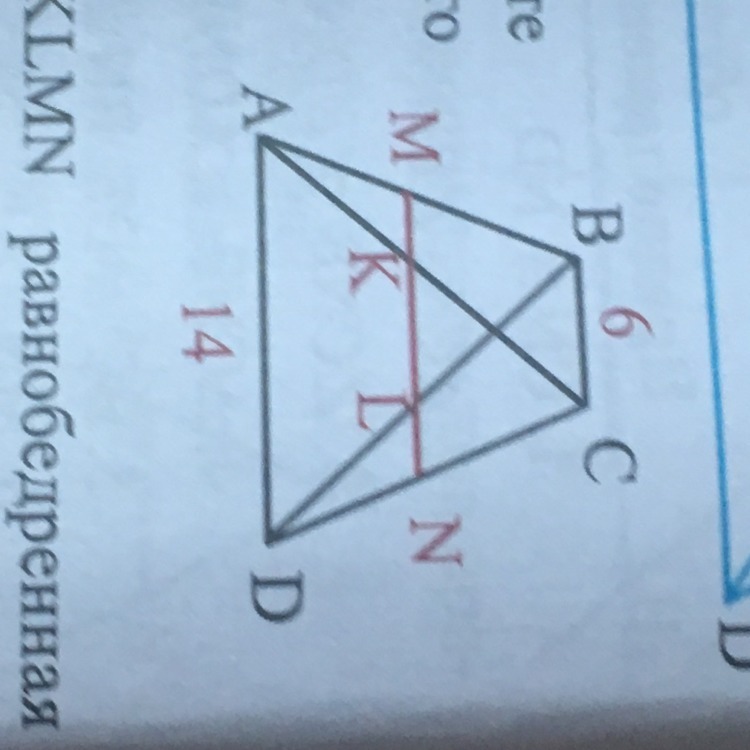 Основания трапеции равны 6 см и 14 см. Найдите длину отрезка KL средней линии,заключённого между диагоналями.( ответ 4 см)мне нужно решение пожалуйста помогите сделать