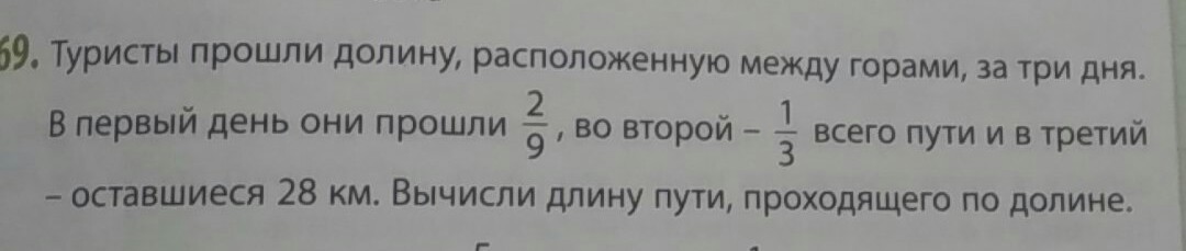 Пусть x км весь путь, тогда 2/9 -первый день, 1/3 -второй день