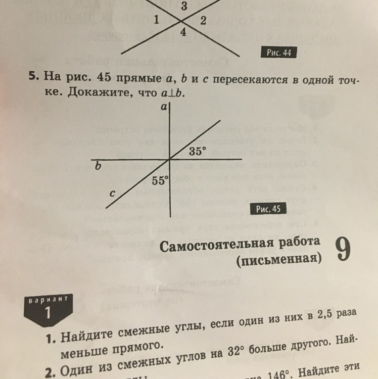 На рис. 45 прямые a,b и с пересекаются в одной точке. Докажите, что a перпендикулярна b