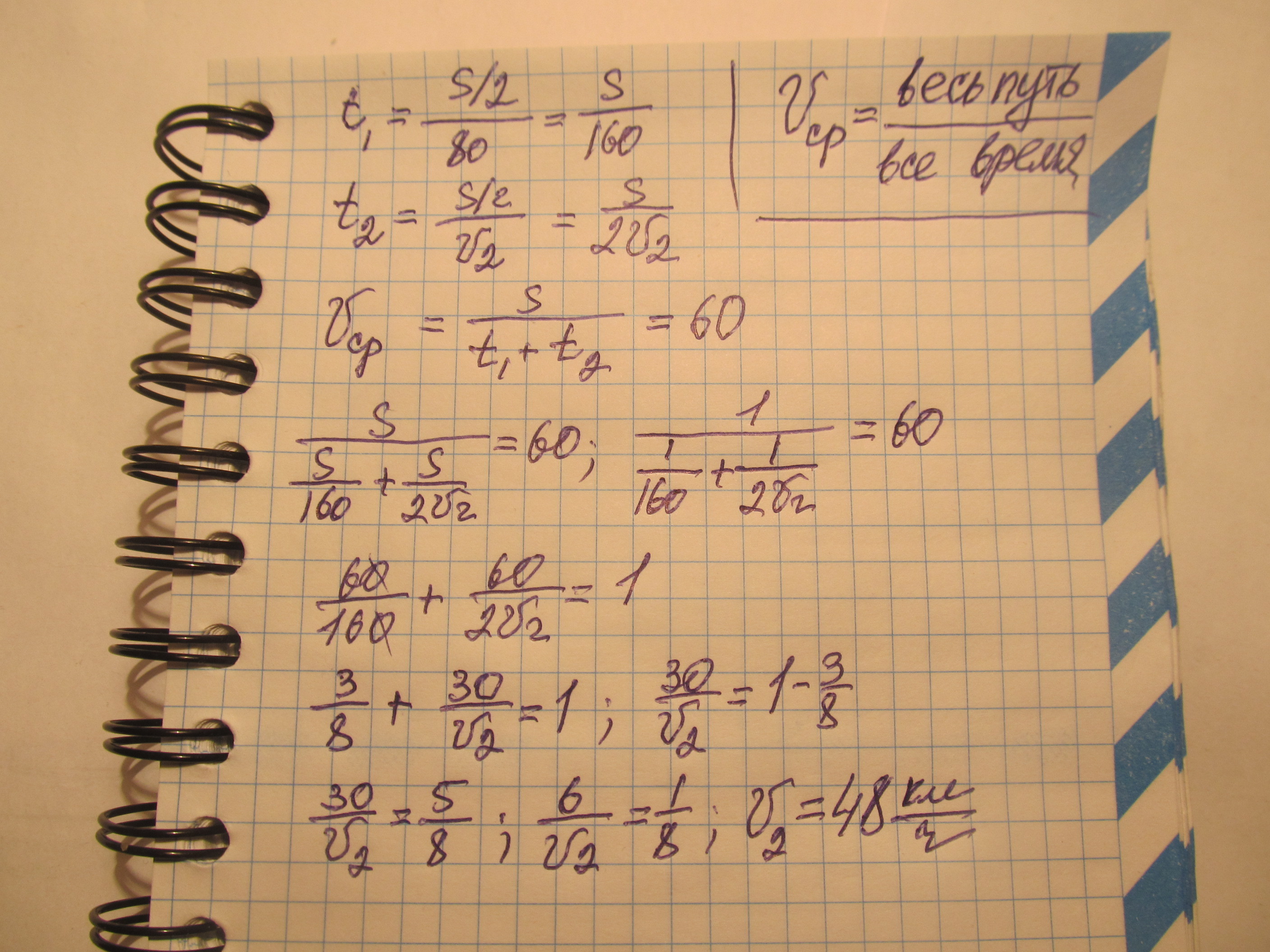 Автомобиль проходит первую половину пути со скоростью 80 км/час средняя скорость равна 60, найти с какой скоростью он прошол 2 половину пути
