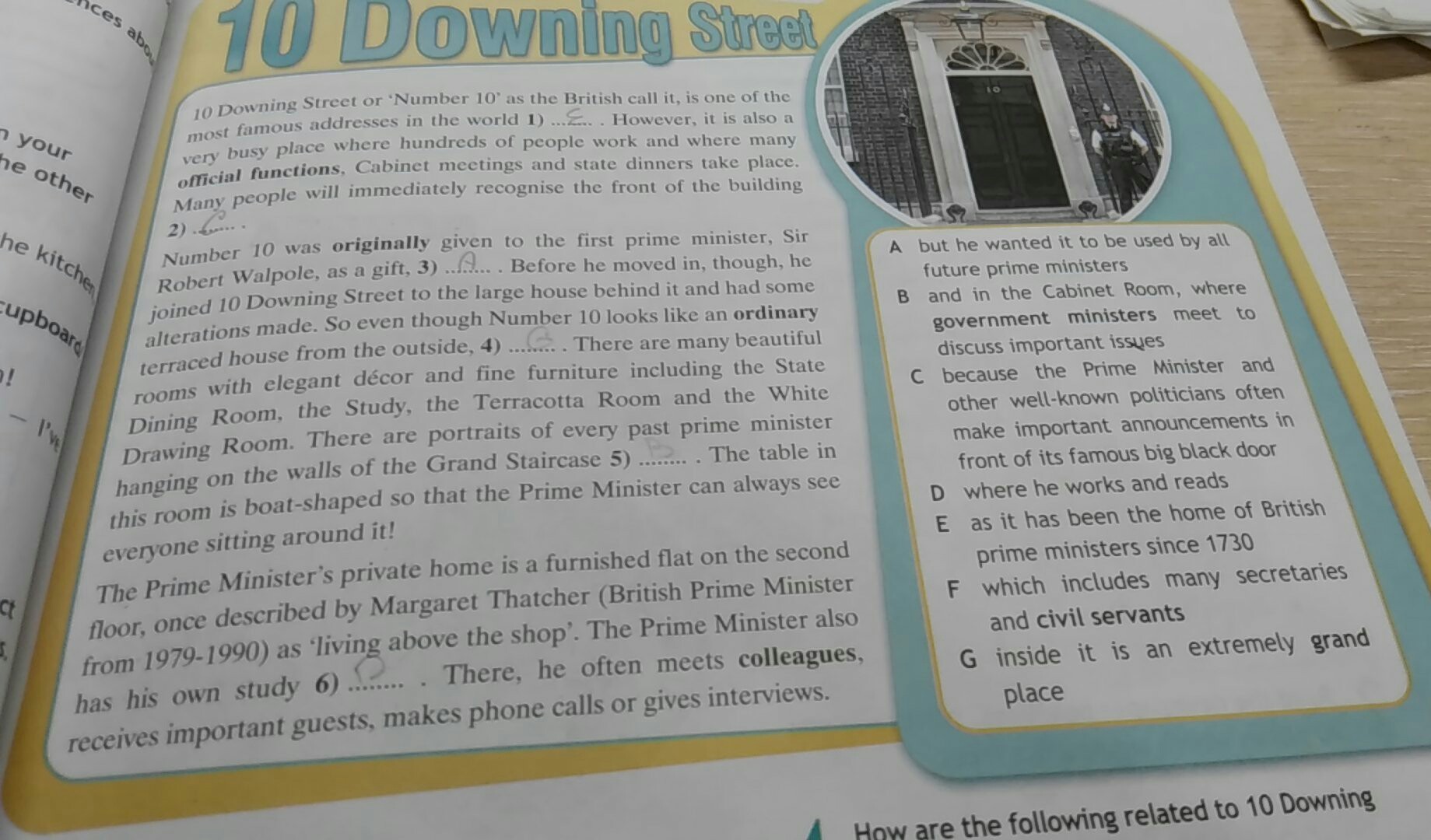 Даунинг-Стрит или *N Количество ИО, как называют его британцы, является одним изсамых известных адресов в мире 1)Однако. это такжеочень оживленное место, где работают сотни людей и где многоИа! должностные обязанности. Состоялись заседания кабинета министров и государственные ужины.Многие сразу узнают фасад зданияНомер 10 изначально был дан первому премьер-министру. СэрРоберт Уолполь, в подарок, 3) А. Перед тем, как он переехал в, хотя, онприсоединился к 10 Даунинг-стрит в большой дом за ним и имел некоторыеизменений. Так что хоть номер 10 выглядит как обычныйтеррасный дом снаружи, 4)Есть много красивыхномера с элегантным декором и изысканной мебелью, включая государствоСтоловая, кабинет. Терракотовая комната и Белыйгостиная. Есть портреты всех прошлых премьер-министроввисящие на стенах парадной лестницы с)Таблица вэта комната в форме лодки, так что премьер-министр всегда может видетьВсе сидят вокруг!Частный дом премьер-министра-меблированная квартира на втором этаже.По, когда-то описанная Маргарет Тэтчер (Премьер-министр Великобританиис 1970-1990 годов, как жил выше цеха премьер-министр такжеимеет собственное исследование 6)000 0 000Там он часто встречается с коллегамипринимает важных гостей, звонит по телефону или дает интервью.