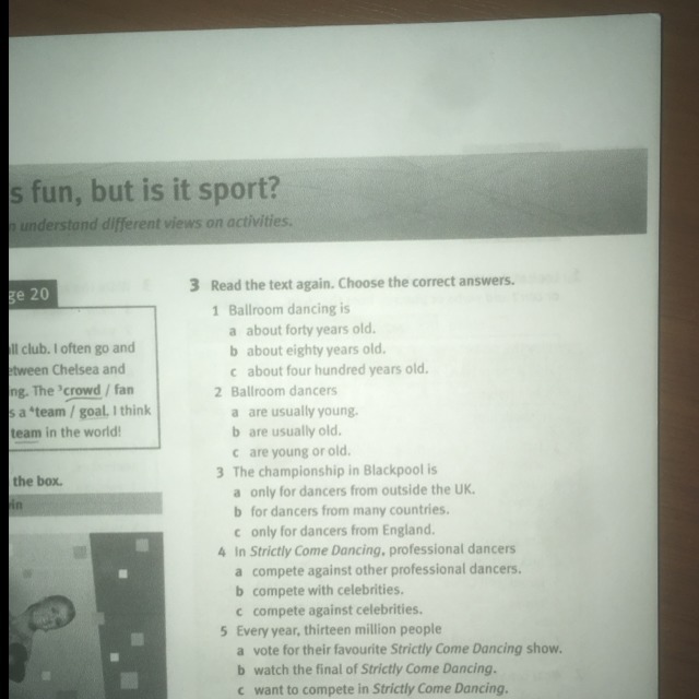 3 Прочтите текст еще раз. Выберите правильный ответ. 1 Бальные танцы - около сорока лет, b около восьмидесяти лет. c около четырехсот лет. 2 Бальные танцоры обычно молоды. b обычно старые. c являются молодыми или старыми, 3 Чемпионат в Блэкпуле является единственным для танцоров из-за пределов Великобритании. b для танцоров из многих стран, c только для танцоров из Англии. 4 В Strictly Come Doncing профессиональные танцоры конкурируют с другими профессиональными танцорами. b конкурировать со знаменитостями, c конкурировать с знаменитостями. 5 Каждый год тринадцать миллионов человек голосуют за свое любимое шоу Strictly Come Dancing. б смотрите финальную часть Strictly Come Donclng. c хочет сразиться в Strictiv Come Daneina