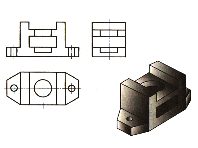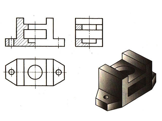 Рисунок содержит фронтальный и профильный разрезы (штриховка на них не показана), вид сверху и аксонометрическое изображение. Дополните разрезы штриховкой, где это необходимо