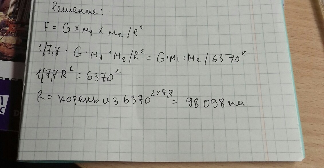 Вычислите высоту на которой гравитационная сила, действующая на тело будет в 7,7 раз меньше, чем на поверхности Земли. Радиус Земли принять равным 6370 км.