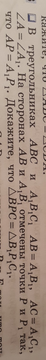 В треугольниках ABC и A1B1C1 AB=A1B1, AC=A1C1 угол A=углуA1.На сторонах ABи A1B1 отмечены точки P и P1 так, что AP=A1P1.Докажите что треугольник BPC=треугольнику B1P1C1