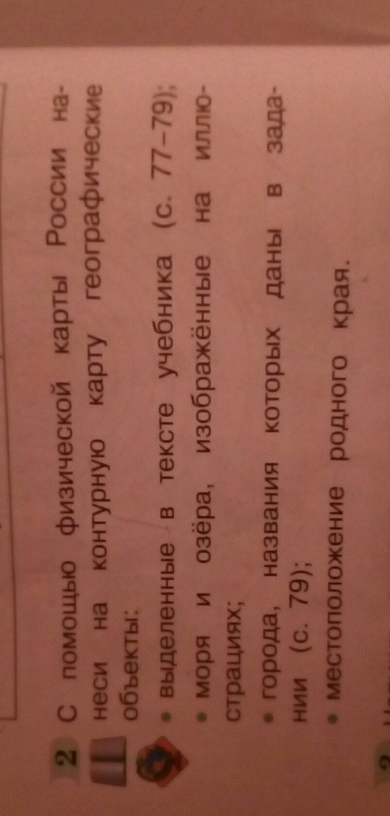 Нужно просто подписать на контурной карте названия городов, озер, морей, которые у тебя должны быть выделены на странице 77-79.