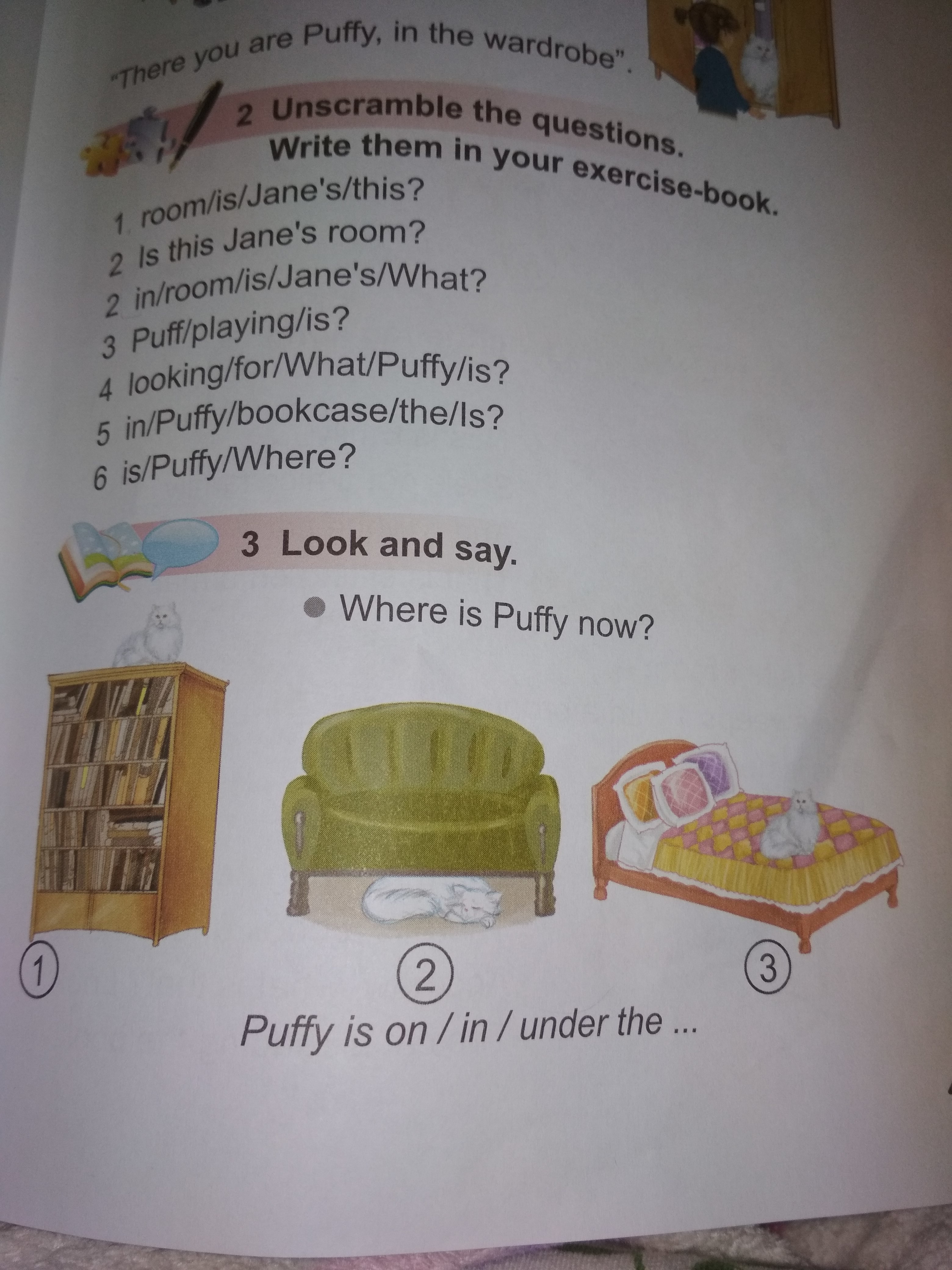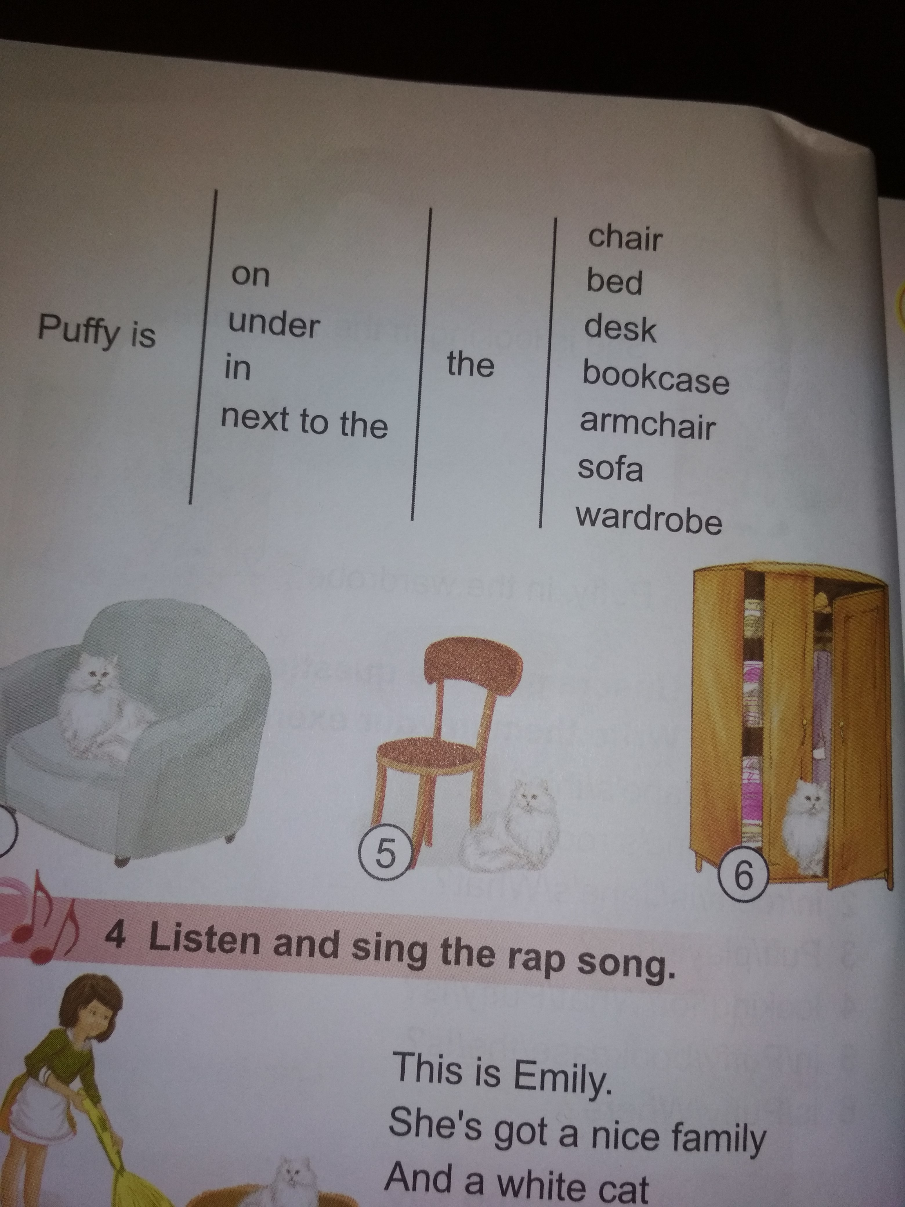 Puffy is on the wardrobe. Puffy is under sofa. Puffy is on the bed.