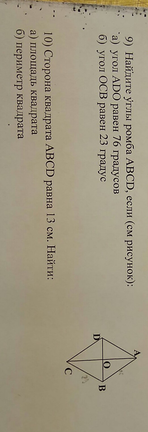 9:найдите углы ромба abcd,если (см.рисунок):а)угол ado равен 76градусов б)угол ocb равен 23 градуса. пж ещё 10