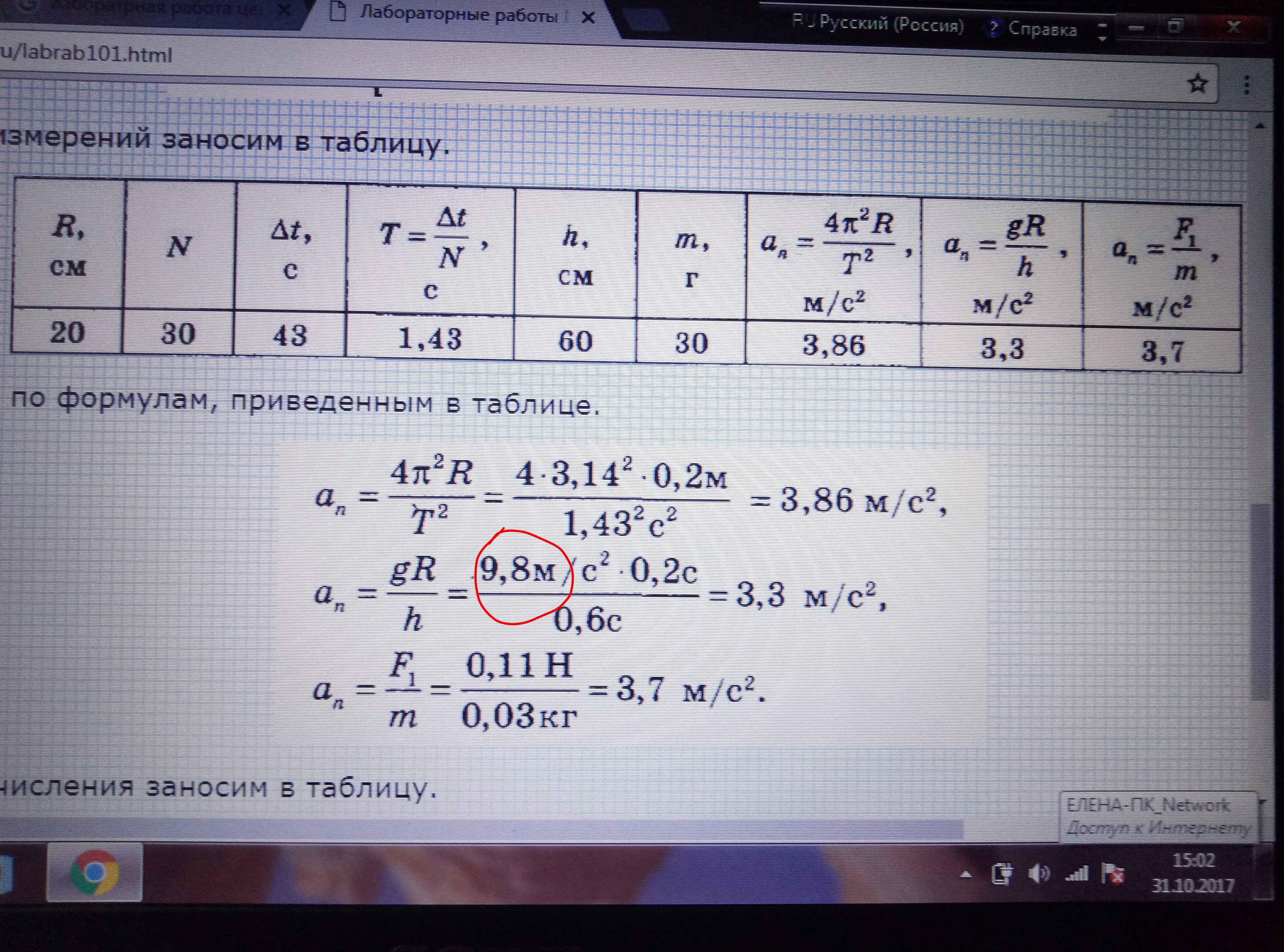 В последней формуле an=F1/m масса m=30г=0,03 кг , а сила измерена динамометром, когда оттягивали его на расстояние, равное радиусу окружности, в таблице у вас нет этого измерения.