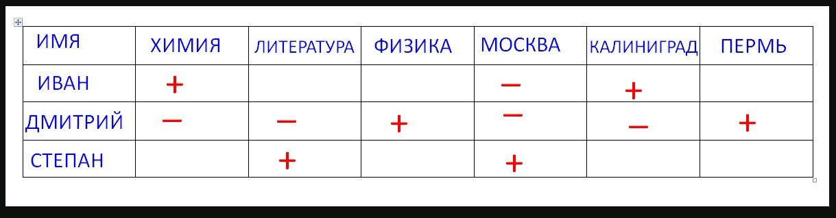6)В таблице у нас остался один город,так Степан москвич,а Дмитрий-пермяк⇒Иван из Калининграда,ставим +.