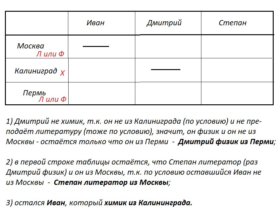 Три друга- Иван,Дмитрий,Степан преподают различные предметы (химию,литературу,физику) в школах Москвы,Калининграда и Перми.Известно:Иван работает не в Москве ,а Дмитрий не в Калининграде ;москвич преподает не физику ,тот,кто работает в Калининграде ,преподает химию;Дмитрий преподает не литературу. Какой предмет и в каком городе преподает каждый из товарищей?