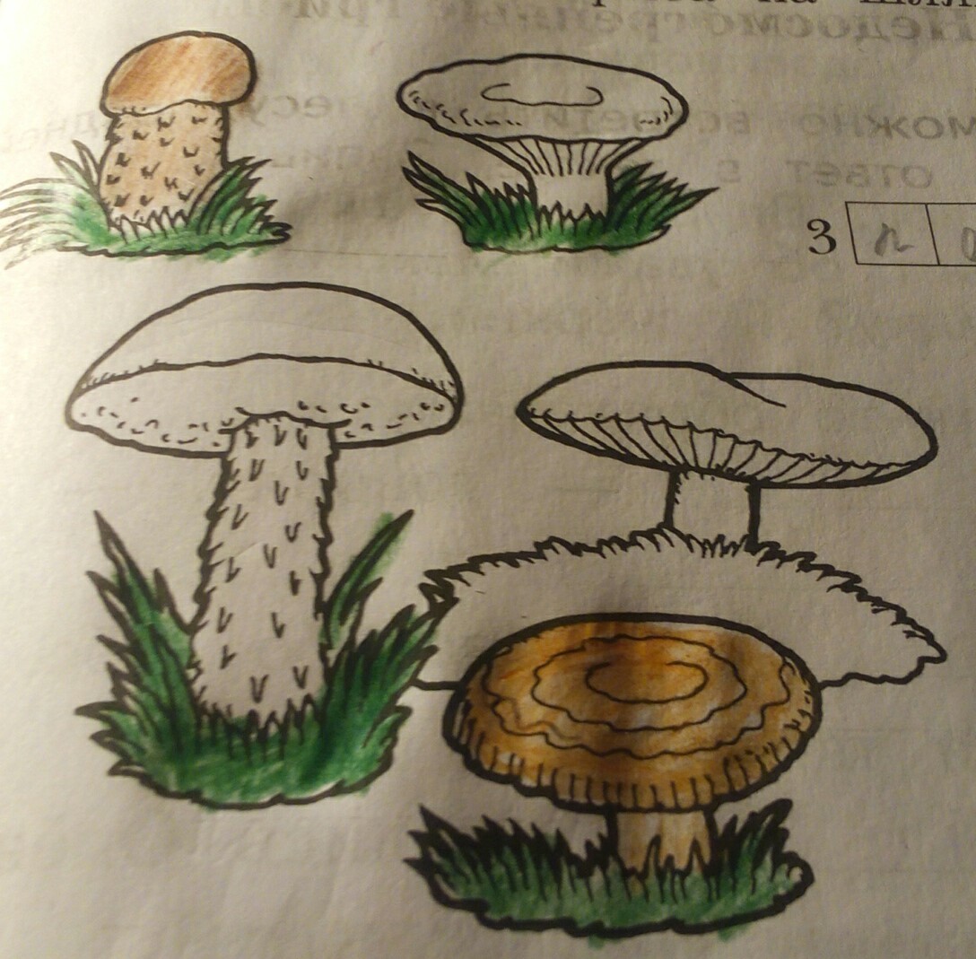 ораньжевого-красная шляпка и ножка белая (подосиновик)(На ней наблюдается чешуйки коричневого цвета чаще всего коричневого) (волнушка)- шляпка розовая ножка-немного светлее (сыроежка)-шляпка зеленовато бурая до красного оттенка сухая на ощупь блестящая или матовая ножка-в основном белая или в тон шляпки внутри ножка полая (подберезевик)-шляпка-ближе к бурым оттенкам ножка- светлая с черно- коричневыми чишуйками