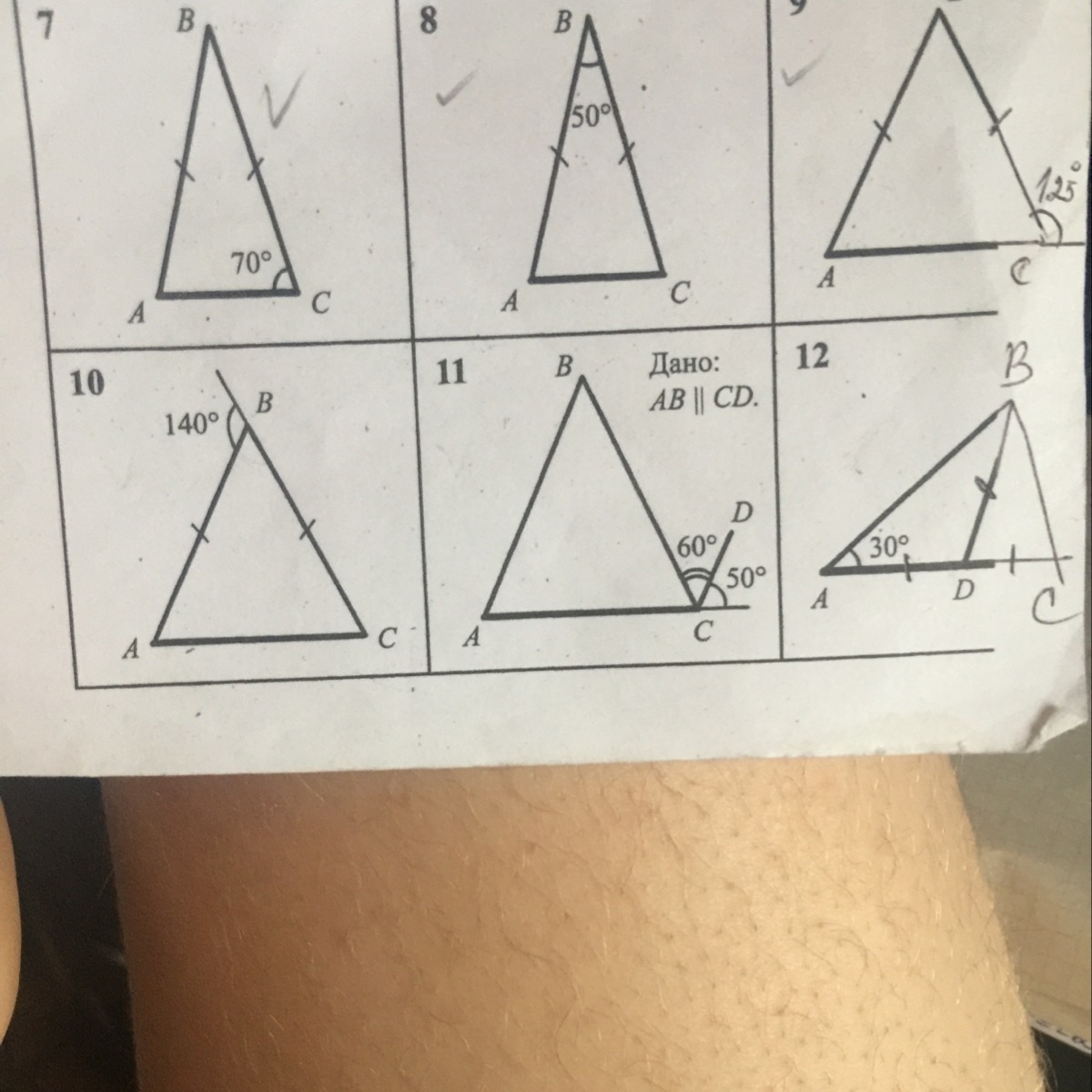 Геометрия 7 класс. Задачи и упражнения на готовых чертежах Рабинович,таблица 7.9. Сумма углов треугольника. Номер 10-12