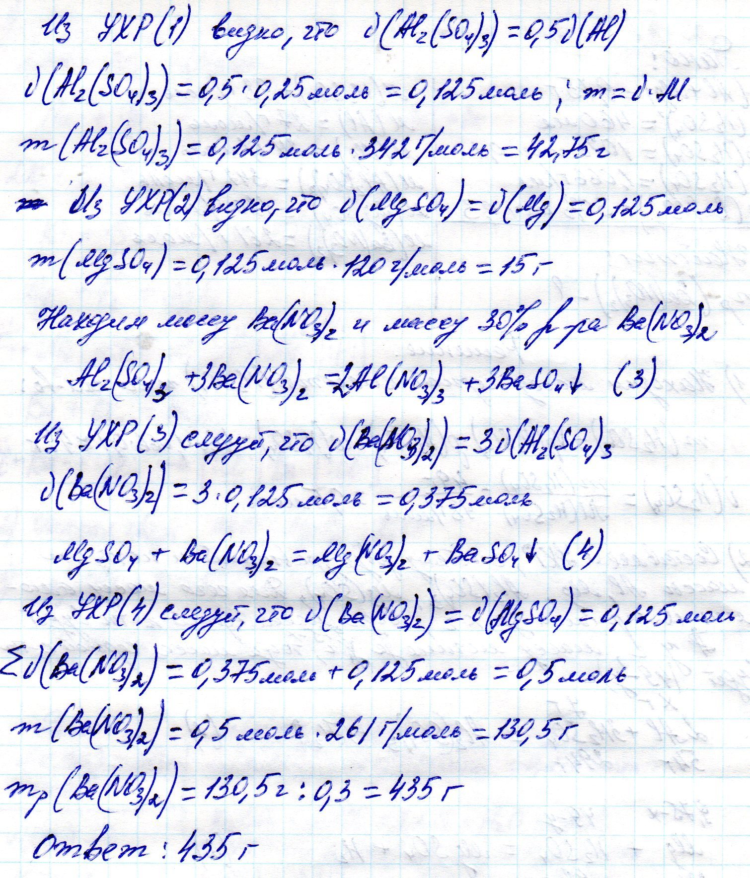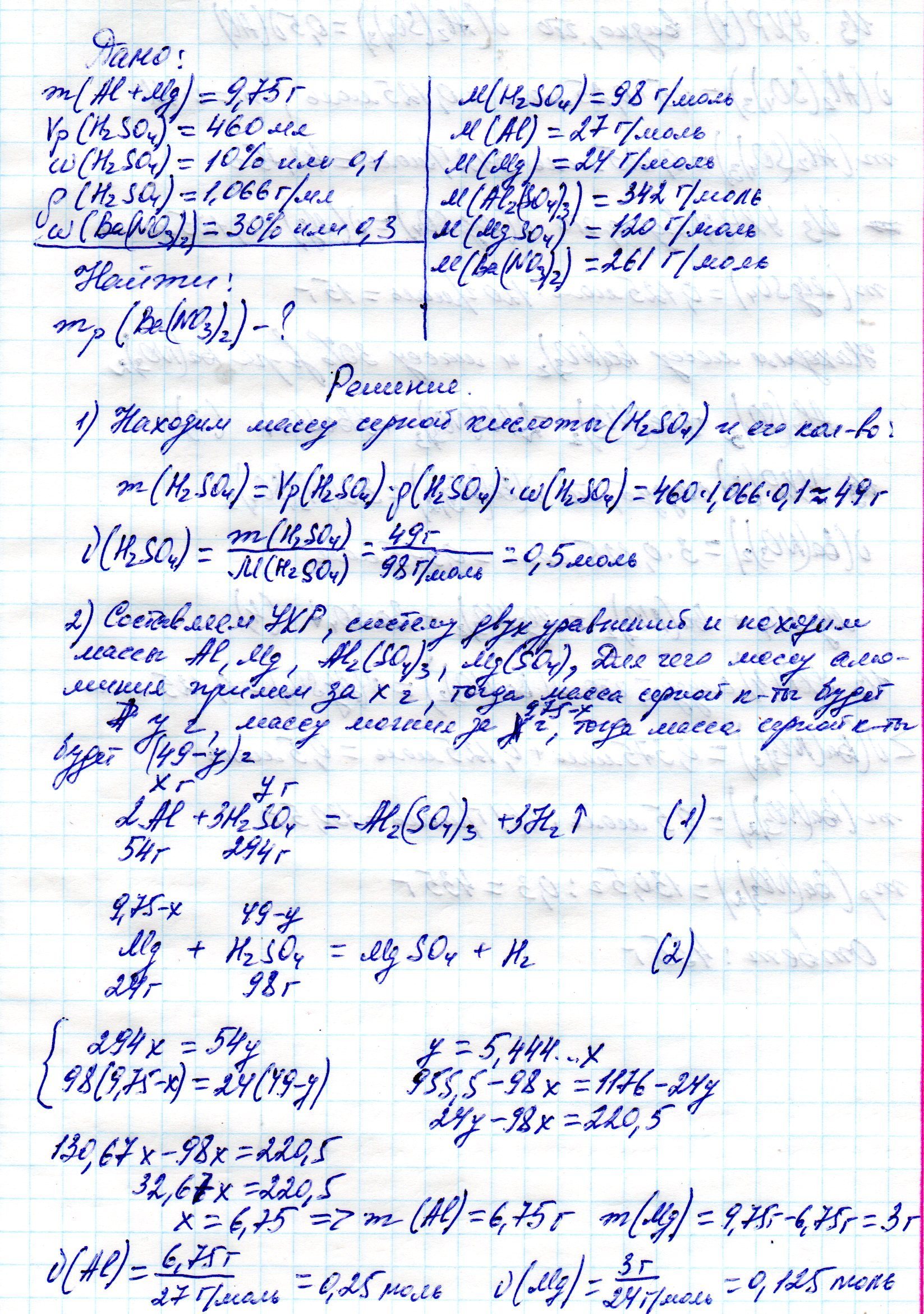 Для реакции 9.75 г смеси алюминия и магния с серной кислотой требуется 460 мл 10-процентного раствора серной кислоты (плотность - 1.066 г/мл). Определить, какая масса 30-процентного раствора нитрата бария вступит в реакцию с образовавшимися сульфатами металлов.