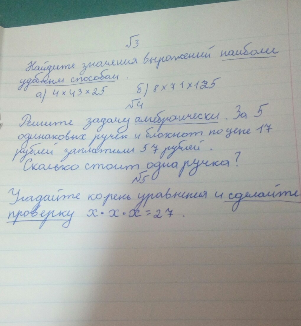№4. Пусть ручка стоит Х рублей,тогда 5 ручек будет стоить Х*5 =5Х рублей, а вся покупка вместе с блокнотом (5Х +17) рублей. Так как по условию за все заплатили 57 рублей, составим и решим уравнение:
