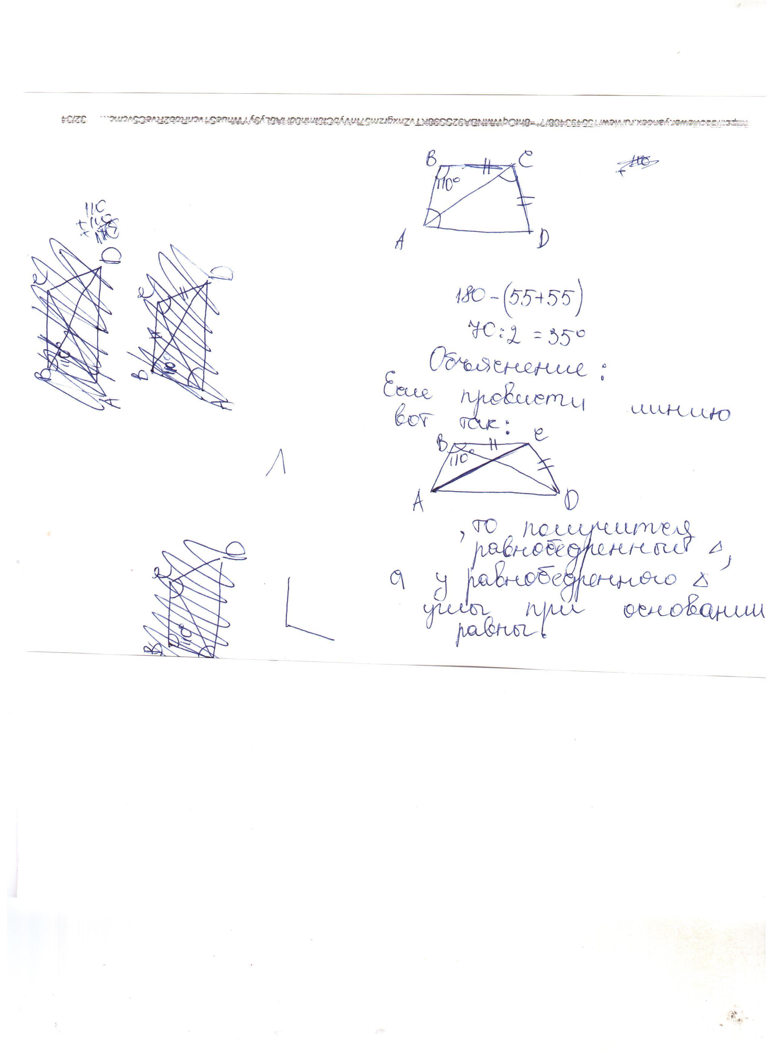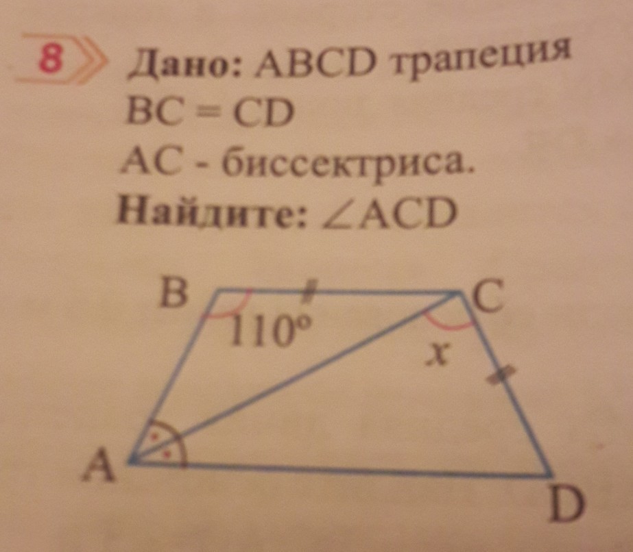 треугольник АВС должен в сумме иметь 180 градусов, у нас угол В равен 110, значит, А и С =35;( 110+35+35= 180) А ТАК КАК биссектриса делит угол пополам, то угол АСD будет тоже равен 35 , и если сложить все углы ( для проверки) то сумма 360 градусов! а трапеция как раз имеет полностью 360 градусов, ОТВЕТ 35