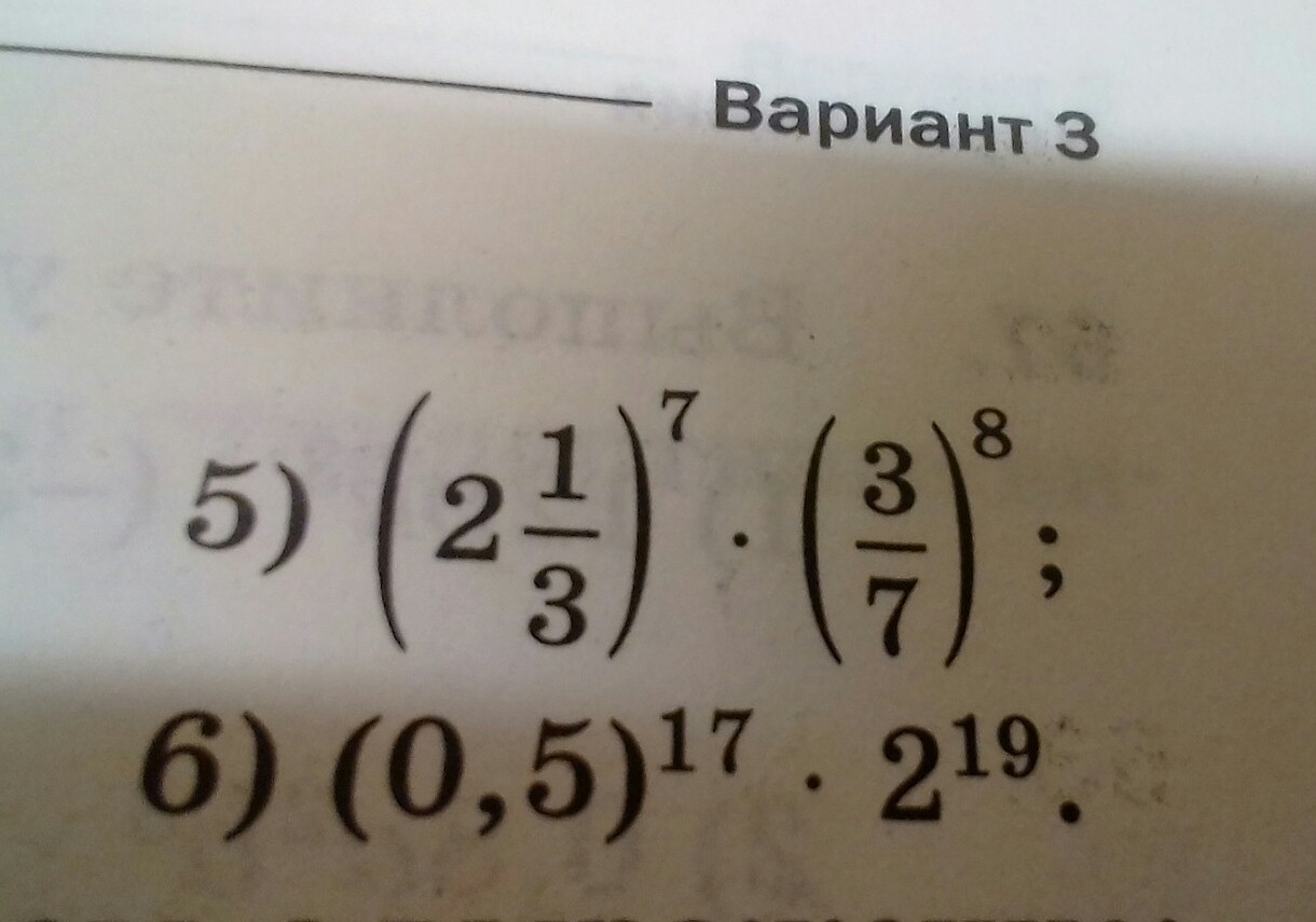 5). 2 1/3=7/3; 7/3=(3/7)^-1; (3/7^-1)^7*(3/7)^8=(3/7)^-7*(3/7)^8=(3/7)^1=3/7. 6).(0,5)^17*2^19=(2^-1)^17*2^19=2^-17*2^19=2^2=4.