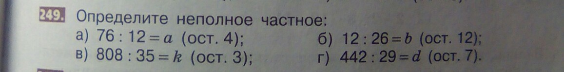 76/12=6 (ост. 76-72=4); 808/35=23 (ост. 808-805=3); 12/26=0 (ост. 12-0=12) 442/29=15 (ост. 442-435=7
