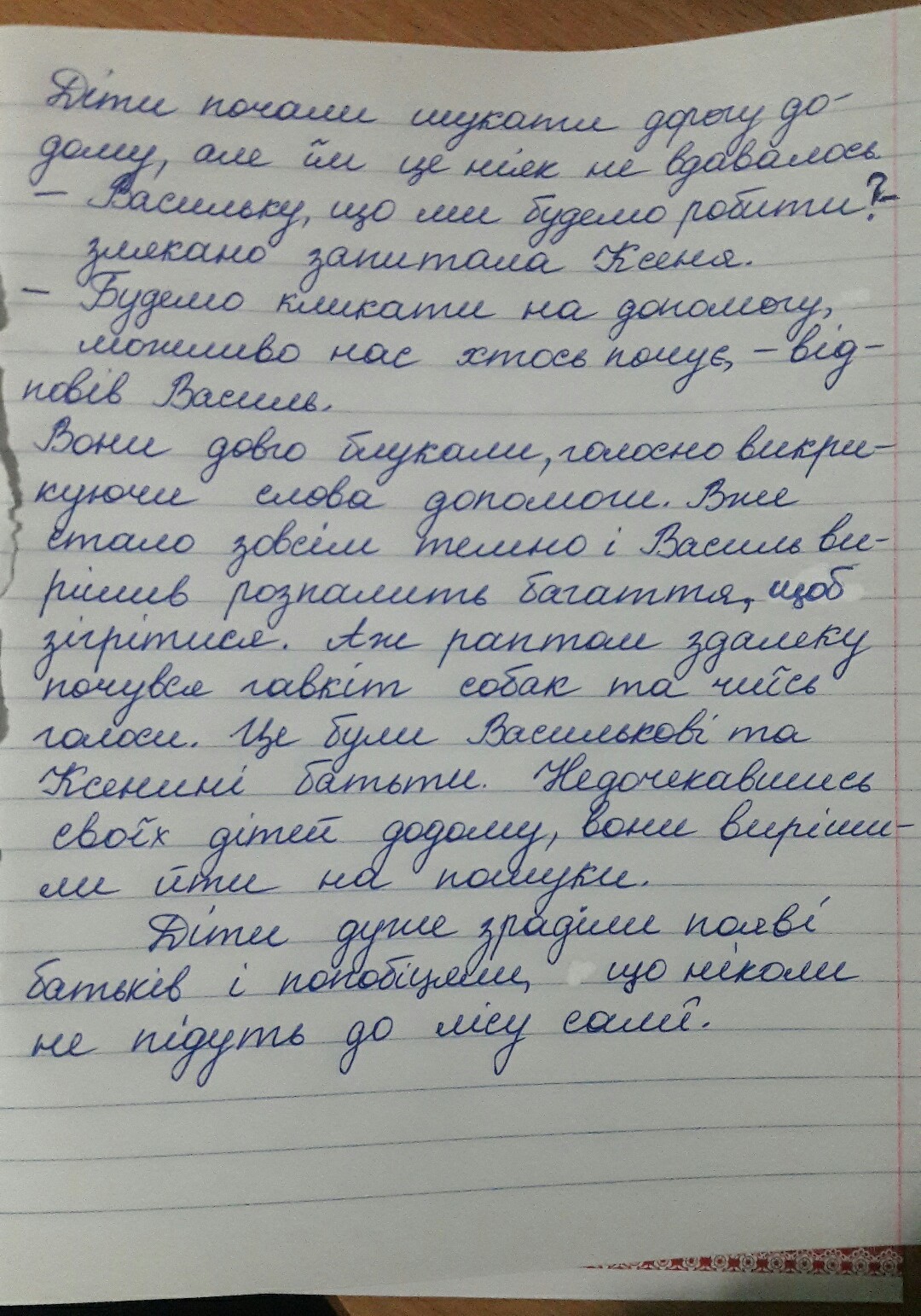 Початок:Василь і Ксеня пішли в ліс по ягоди.І хоч їм здавалося,що вони трошки походили,але незчулися,як почало вечоріти.Тільки тоді діти побачили,що вже блукають у незнайомому місці......