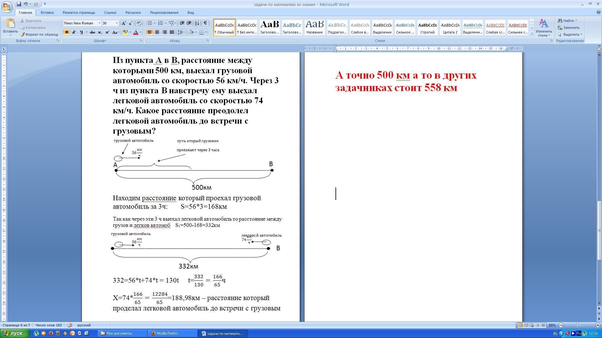 Из пункта А в В, расстояние между которыми 500 км, выехал грузовой автомобиль со скоростью 56 км/ч. Через 3 ч из пункта В навстречу ему выехал легковой автомобиль со скоростью 74 км/ч. Какое расстояние преодолел легковой автомобиль до встречи с грузовым?