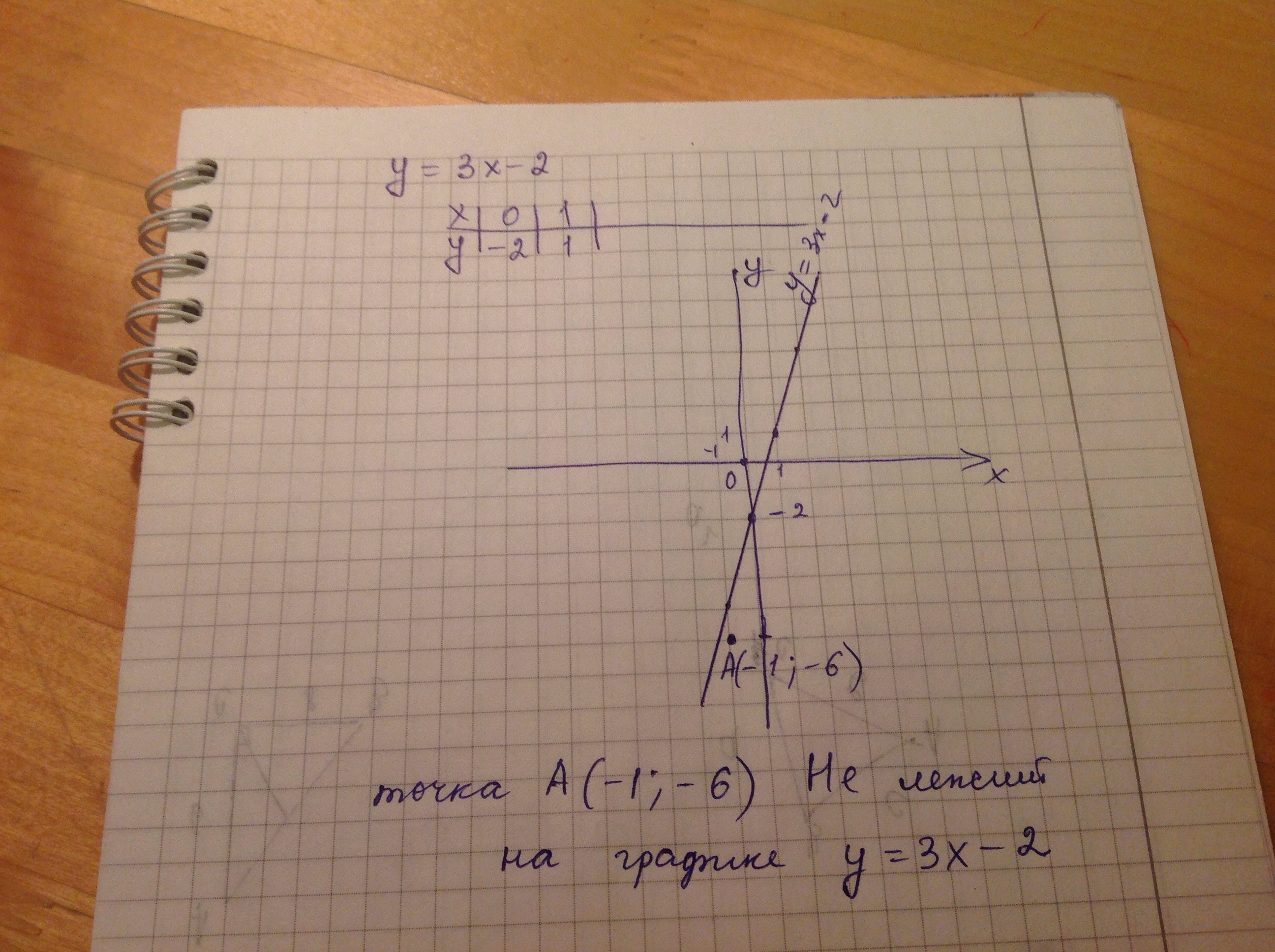 постройте график функции y=3x-2. лежит ли на этом графике точка А (-1;-6)