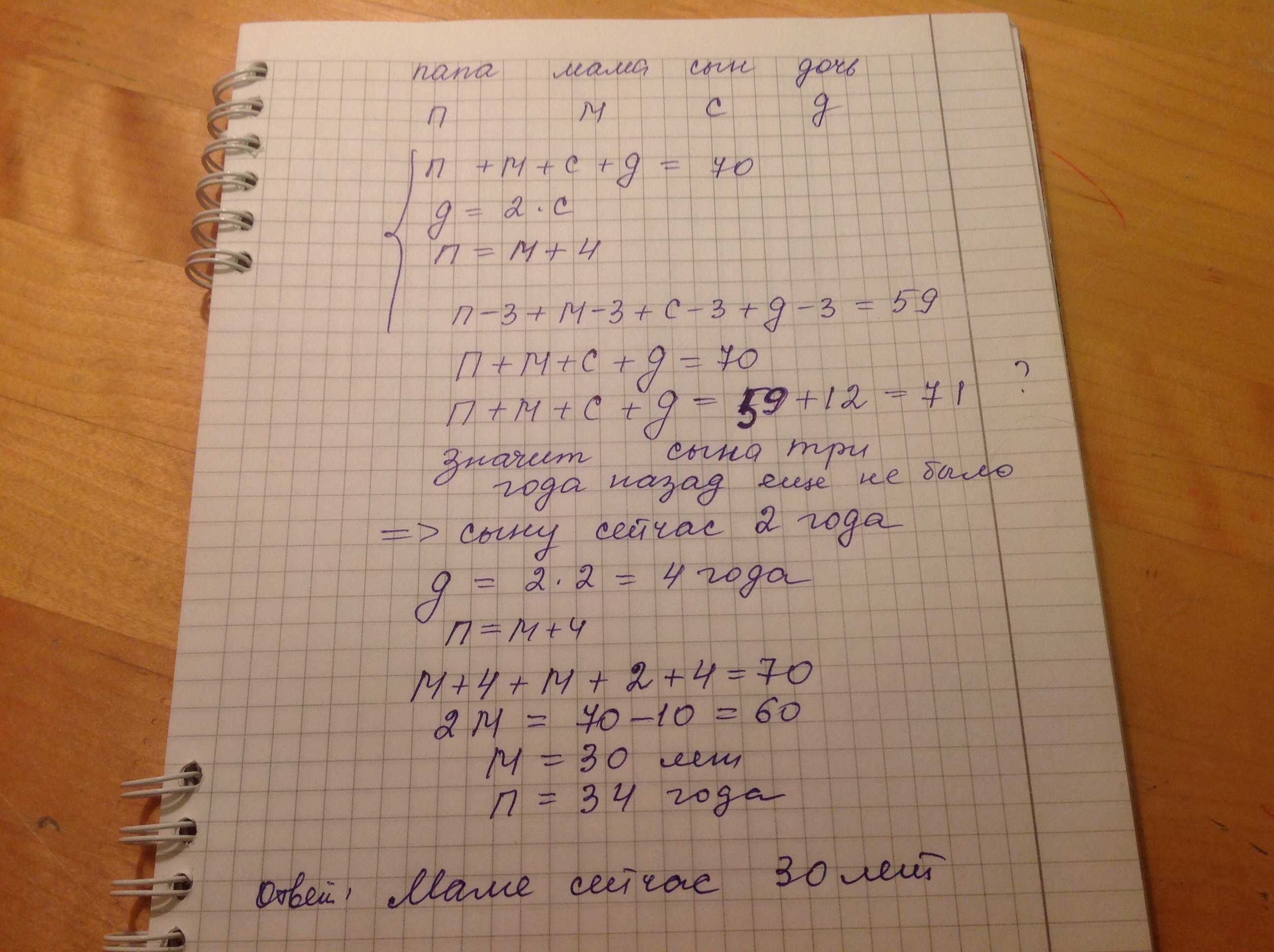 В семье проживают папа, мама, сын и дочь. Сейчас им вместе 70 лет. Дочь старше сына в 2 раза, а папа старше мамы на 4 года. Три года тому назад им вместе было 59 лет. Сколько лет сейчас маме?
