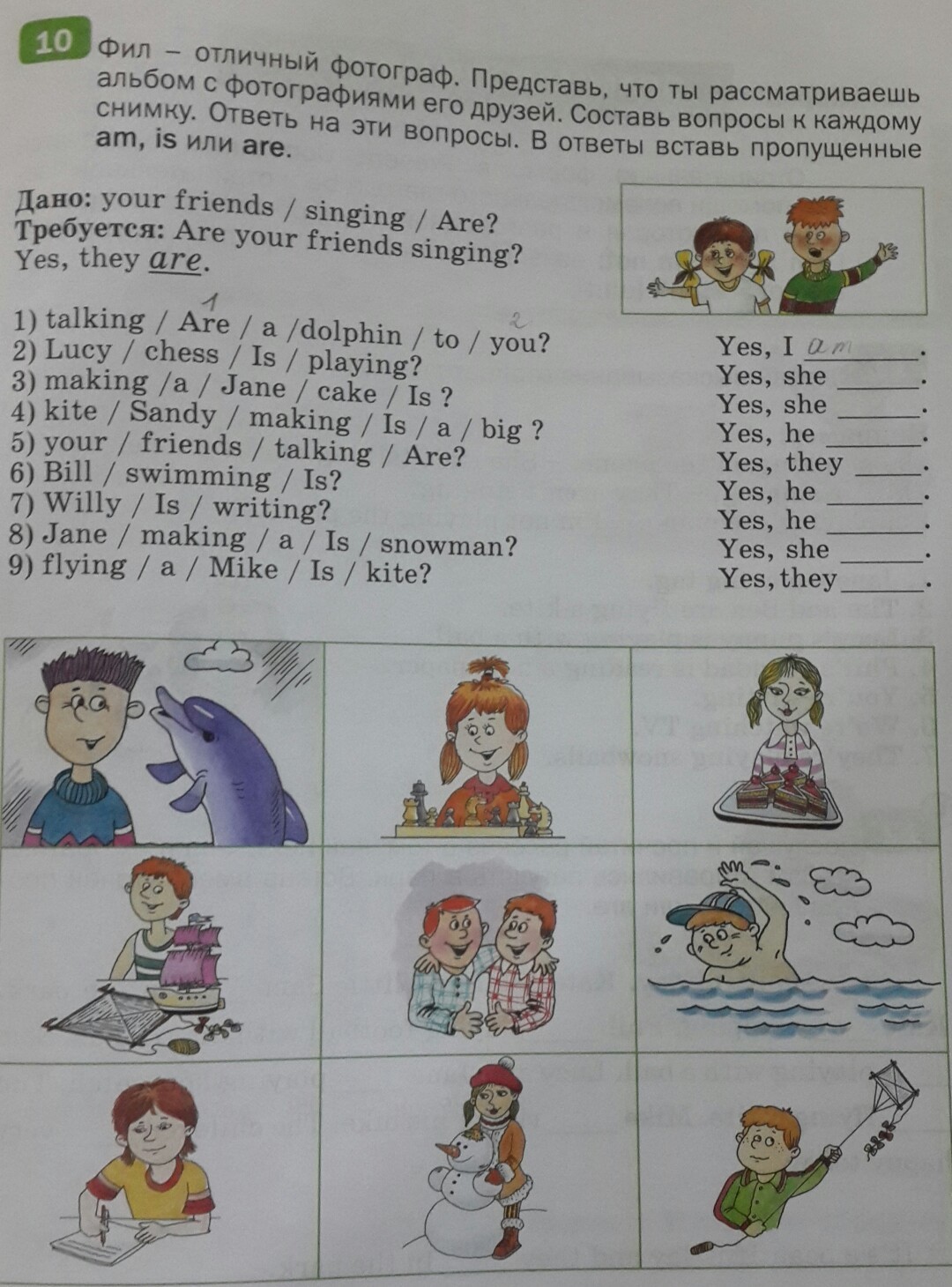 фил отличный фотограф.представь что ты расматриваешь альбом с фотографиями его друзей. составь вопросы к каждому снимку. в ответы вставь пропущенные am, are,is