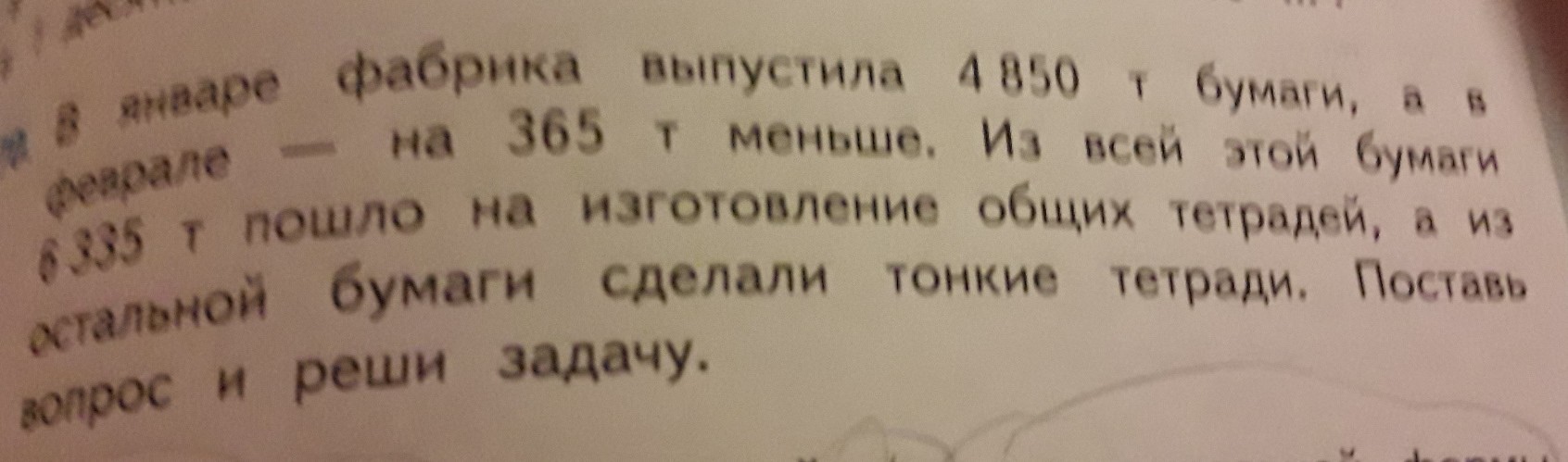 В январе фабрика выпустилп 4 850 т бумаги, а в феврале - на 365 т меньше. Из всей этой бумаги 6 335 т пошло на изготовление общих тетрадей, а из остальной бумаги сделали тонки тетради. Поставь ВОПРОС и РЕШИ ЗАДАЧУ. (+ условие/краткая запись пж)