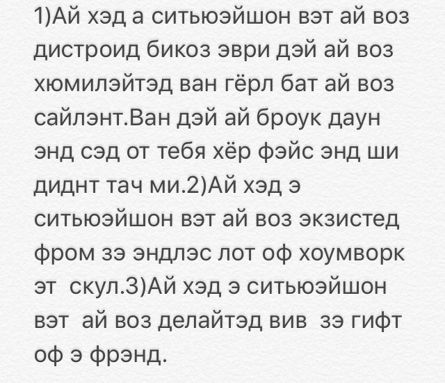 1)I had a situation that I was destroyed because every day I was humiliated one girl but I was silent.One day I broke down and said all in her face and she didn't touch me. 2)I had a situation that I was exhausted from the endless lot of homework at school .3)I had a situation that I was delighted with the gift of a friend.